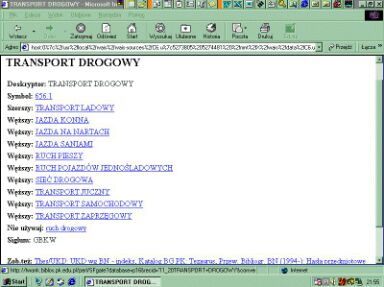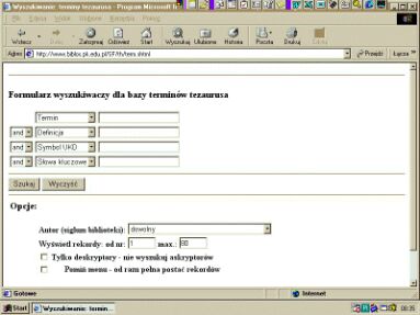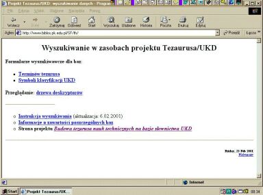 Rys. 1. Menu systemu przeszukiwania tezaurusa Po scaleniu danych baza jest przeszukiwana w celu wyeliminowania synonimów. Możliwość wyświetlania deskryptorów w porządku symboli UKD i w postaci hierarchicznego drzewa ułatwia modyfikację. Pod koniec 1997 roku baza liczyła około 2000 rekordów, a w 1999 roku było ich ponad 20.000. Planowane było wprowadzenie ok. 40.000 rekordów do końca 2000 roku. Plan ten został zrealizowany. Uczestnicy projektu pozostają w codziennym kontakcie przy pomocy poczty elektronicznej. Przygotowano także specjalną, zamkniętą listę dyskusyjną, na którą można zgłaszać wszelkie uwagi i zapytania. Wszystkie decyzje dotyczące projektu są omawiane z przedstawicielami bibliotek uczestniczących w budowie tezaurusa. Regularne spotkania - kilka razy w roku - są organizowane w różnych miejscach kraju. Uczestnicy projektu wybrali różne działy UKD, zaczerpnięte z kompletnego wydania tablic i przygotowują rekordy artykułów deskryptorowych. Terminy tezaurusa są uzupełniane prostymi, złożonymi i rozwiniętymi symbolami UKD. Jest dopuszczalne, aby jeden symbol UKD odnosił się do dwóch lub więcej deskryptorów. Nie dla każdego symbolu UKD opracowano deskryptor. Pominięto te symbole UKD, które nie są stosowane w opracowaniu rzeczowym zbiorów bibliotek technicznych i rolniczych. Zakończenie prac nad budową deskryptorów zaplanowano na koniec 2000 roku. W roku 2001 MEN zaprzestało finansowania projektu. Prace nad wprowadzaniem danych zostały zgodnie z planami zakończone. Następnie baza będzie porządkowana w celu ostatecznego wykluczenia synonimów i sprawdzenia poprawności użytych terminów. Można zastanowić się, dlaczego zdecydowano się na pozostanie przy UKD, pomimo jego wad? Testy przeprowadzone w ostatnich latach dowiodły, że UKD jest wciąż żywym językiem i może być dostosowana do potrzeb systemów komputerowych. Od 1993 roku istnieje Master Reference File, komputerowa kartoteka haseł wzorcowych, składająca się z około 64.000 rekordów, zarządzana obecnie przez dyrektora technicznego UKD w Hadze. Zbudowana w języku angielskim kartoteka została przetłumaczona na język niemiecki. Zmiany organizacyjne wewnątrz instytucji zarządzającej UKD (UDC Consortium http://www.udcc.org.) przyspieszyły prace nad modernizacją tablic UKD. Można to dostrzec także w Polsce - w ostatnich latach została wydana nowa, pełna wersja tablic dla numerów 8 i 9, w 1993 roku "pośrednia" wersja dla potrzeb centrów informacji (z wieloma zmianami), a następnie wersja najnowsza, najbardziej aktualna, przygotowana na użytek bibliografii narodowej, uwzględniająca kolejne zmiany. To ostatnie wydanie, opracowane przez Bibliotekę Narodową w Warszawie, jest szczególnie ważne i przydatne w początkowej fazie prac nad adaptacją UKD dla potrzeb systemów komputerowych. Jego wersja zautomatyzowana, opracowana jako baza danych, zaoszczędziłaby nam sporo pracy. Niestety, zostało ono opublikowane zbyt późno. Jednakże i ona nie zaspokoiłaby w pełni naszych potrzeb przy tworzeniu tezaurusa w oparciu o tablice UKD. Nie jest również wystarczającym narzędziem do katalogowania kolekcji bibliotek naukowych (w obydwu przypadkach niezbędna jest pełna wersja tablic), niemniej jednak ułatwiłaby konwersję symboli UKD na ich werbalne odpowiedniki. Kolejnym pytaniem jest, dlaczego zdecydowano się na budowę tezaurusa w oparciu o UKD? Ten rodzaj języka indeksowania łatwo dostosować można do potrzeb zautomatyzowanych systemów bibliotecznych. Pozwala to na pewną swobodę działania: można, np. wprowadzać nowe, nie istniejące w UKD terminy. Kolejnym argumentem jest możliwość automatycznego powiązania w przyszłości symboli UKD, zamieszczonych w bibliograficznych opisach dokumentów z odpowiednimi deskryptorami z bazy danych. Jest mało prawdopodobne, aby biblioteki uczestniczące w pracach nad przygotowaniem tezaurusa zaprzestały innych sposobów opracowania rzeczowego. Nawet teraz niektóre z nich stosują równolegle kilka języków informacyjno-wyszukiwawczych (np. Biblioteka Główna Politechniki Świętokrzyskiej). Biblioteka Główna Politechniki Krakowskiej planuje wprowadzenie omawianego powyżej języka KABA, jako drugiego narzędzia indeksowania i dodatkowego klucza wyszukiwawczego. Tezaurus powstały w wyniku współpracy polskich bibliotek naukowych i technicznych mógłby znaleźć zastosowanie w każdym komputerowym systemie bibliotecznym, umożliwiając wprowadzenie do opisów bibliograficznych w zautomatyzowany sposób słownych odpowiedników symboli UKD. Tezaurus może także stanowić dodatkowe narzędzie wyszukiwawcze w wersji WWW katalogów OPAC. To ostatnie zastosowanie jest możliwe dzięki implementacji oprogramowania powstałego podczas realizacji projektu (rys. 2.). Pozwala ono na równoczesne przeszukiwanie katalogów wielu bibliotek. Jedynym wymogiem jest wprowadzenie symboli UKD do opisów bibliograficznych. Proces wyszukiwania rozpoczyna się od przeglądania deskryptorów bazy tezaurusa (rys. 3.). Po dokonaniu przez użytkownika wyboru deskryptora, wyświetla się rekord tezaurusa z informacją na temat ilości rekordów bibliograficznych indeksowanych według tego deskryptora w poszczególnych bibliotekach. Po wybraniu nazwy biblioteki, wyświetla się lista tytułów dokumentów sklasyfikowanych według wybranego deskryptora. Program, jako przyjazny dla użytkownika, pozwala na formułowanie zapytań w języku naturalnym, następnie identyfikuje dokumenty dzięki symbolom UKD zawartym w deskryptorach rekordów oraz w rekordach bibliotecznych katalogów OPAC. Istnieją także mechanizmy pozwalające na wyszukiwanie dokumentów według terminów nadrzędnych i ma to miejsce w przypadku, kiedy wyszukiwanie według terminów podrzędnych nie dało rezultatów. Dzięki utworzeniu bazy danych znajdującej się w Internecie można przeszukiwać równocześnie katalogi OPAC Bibliote