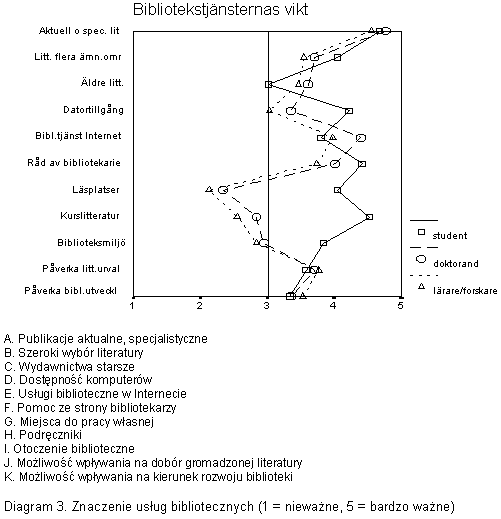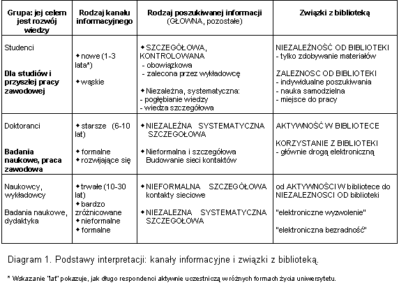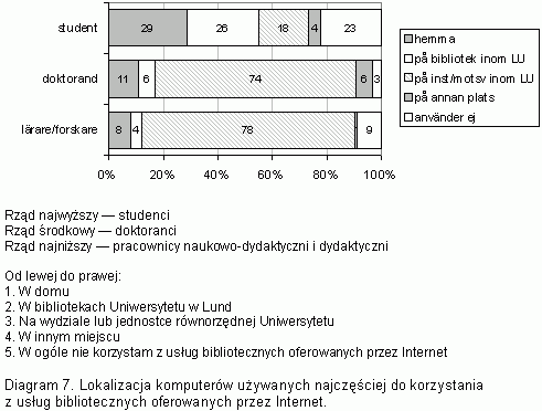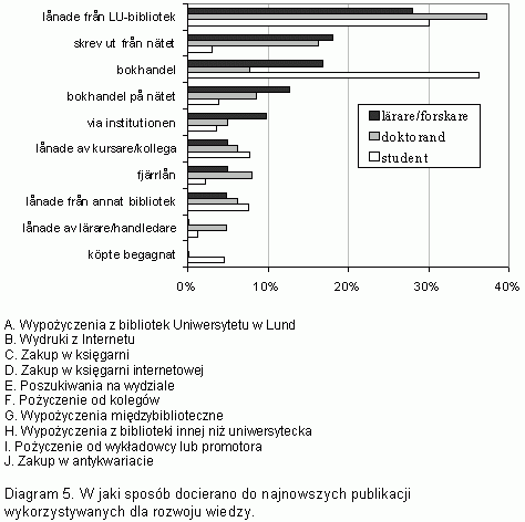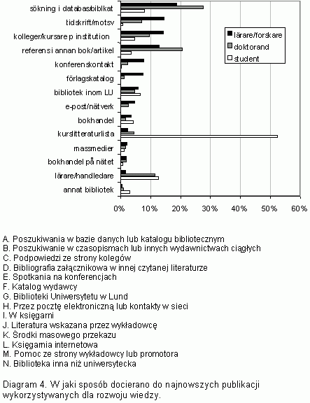 Metoda badania:Barometr biblioteczny oparto o takie same zasady, jak wcześniejsze badania "barometryczne" na uniwersytecie, skierowane do studentów, doktorantów i pracowników naukowo-dydaktycznych. Naczelna zasada głosiła, że punktem wyjścia dla formułowania pytań jest doświadczenie użytkowników, oraz że zebrane odpowiedzi będą podstawą wskazania obszarów wymagających zmian i poprawy. Barometr biblioteczny miał jednak również cel szerszy niż wcześniejsze, miał bowiem stworzyć obraz dostarczania informacji i wykorzystania biblioteki. Przy układaniu ankiety i przygotowywaniu pytań korzystano z trzech różnych materiałów jakościowych. Ankiety przesłano do wybranych przedstawicieli studentów, doktorantów i wykładowców. Do każdej kategorii wybrano około 1000 osób z każdego wydziału/instytutu na uniwersytecie. Oznacza to, że kwestionariusz dostało 5% studentów, 40% doktorantów i 40% wykładowców. Wysłano je tylko w wersji papierowej, pocztą, w połowie kwietnia 2000 r. na adresy domowe respondentów, z załączoną kopertą zwrotną ze znaczkiem. Dwukrotnie wysłano również przypomnienia z prośbą o wypełnienie ankiet. Uzyskano 65% odpowiedzi. Daje to całkiem wysoki wskaźnik odpowiedzi, w miarę równomiernie rozłożonych na poszczególne wydziały, co oznacza, że opinie osób wypełniających kwestionariusz powinny dać stosunkowo dobry obraz doświadczeń wszystkich trzech grup. Możemy także założyć, że grupa tych, którzy nie odpowiedzieli na ankietę, mniej byli zainteresowani czy zaangażowani w sprawy biblioteczne od tych, którzy odpowiedzieli. WynikiWyniki podzielono na trzy części - poziomy. Pierwszy z nich daje całościowy obraz tego, w jaki sposób studenci, doktoranci i wykładowcy korzystają z kanałów informacyjnych i usług bibliotecznych dla rozwoju wiedzy. Formuje on podstawę dalszych interpretacji. Wskazano również kilka najważniejszych różnic między wydziałami/ instytutami. Drugą część wyodrębniono ze względu na satysfakcję studentów i znaczenie usług bibliotecznych. W trzeciej zebrano strukturalne i edukacyjne paradoksy i problemy, dostrzeżone w usługach bibliotecznych i w jakości programów kształcenia. Poziom 1 - zasady interpretacji: kanały informacji i miejsce biblioteki w rozwoju wiedzy:Studenci, doktoranci i wykładowcy na różne sposoby korzystają z kanałów informacyjnych i usług bibliotecznych dla rozwoju wiedzy. Nie można jednak zapominać, że inne są cele ich działalności. Studenci dążą do zdobycia kompetencji najważniejszych dla ich przyszłego zawodu. Wykładowcy i badacze rozwijają obszar wiedzy właściwej dla danej dyscypliny. Doktorantom można by przypisać oba te sposoby funkcjonowania, dominuje jednak działalność ukierunkowana naukowo. Ważnym czynnikiem rozwoju we wszystkich trzech kategoriach są umiejętności wyszukiwania informacji. Szybki rozwój Internetu i elektronicznych baz danych sprawia, że mamy dostęp do ogromnych ilości wartościowych informacji, cennych tak dla uczenia się, jak i badań naukowych. Od dzisiejszych studentów oczekuje się, że pod koniec swojej nauki będą już sprawnie prowadzili głębokie i szczegółowe poszukiwania informacji. Poziom zainteresowania studentów i naukowców źródłami elektronicznymi pokazuje, na ile studia wyższe odpowiadają tym oczekiwaniom. Wyniki pokazują, że studenci korzystają z różnych kanałów komunikacji i usług bibliotecznych w sposób dość wąski, ukierunkowany na konkretne zadanie. Korzystają oczywiście również z kontaktów nieformalnych lub doświadczenia zdobytego w danej dziedzinie, ale tych kompetencji nie dopełniają niejako korzystaniem z mediów elektronicznych ani Internetu (w ankiecie nie było pytania o kanały informacyjne wykorzystywane w czasie wolnym, dla rozrywki, sportu, hobby czy kontaktów towarzyskich), mimo że większość z nich ma dostęp do komputera. Większość ze źródeł wykorzystywanych przy uczeniu się została studentom wskazana przez innych, a więc ich zdobycie nie wymaga umiejętności w wyszukiwaniu informacji. Studenci mogą je kupić w księgarni lub znaleźć w bibliotece. Są więc w tym aspekcie niezależni od usług bibliotecznych. Gdyby mieli natomiast rozszerzyć wybór potrzebnej literatury, udaliby się do biblioteki położonej najbliżej nich. Studenci często są zależni od natychmiastowego dostępu do zasobów, z których muszą skorzystać. Pozostają też zależni od biblioteki zawsze wtedy, gdy studiowanie wymaga od nich samodzielności, elastyczności, indywidualnych poszukiwań. Szybko wzrasta wykorzystanie kanałów informacyjnych przez doktorantów. Mają oni więcej doświadczenia w korzystaniu z kontaktów formalnych i systemów informacyjnych dla wyszukiwania informacji, ale również budują kontakty nieformalne w swojej dziedzinie. Pozostają jednak także zależni od systemów formalnych. Doktoranci doskonale znają wszystkie nowości - kanały i techniki formalnych poszukiwań, są też najczęstszymi użytkownikami wielu różnych usług bibliotecznych, tradycyjnych i nowoczesnych. Wykładowcy wykorzystywane przez siebie kanały informacyjne tworzyli i zmieniali przez wiele lat. Korzystają oni z wielu różnych sposobów kontaktu, wśród których dominują nieformalne kontakty zawodowe. Taki obraz zgadza się z wynikami uzyskanymi w badaniu Seldén (1999). Dzięki ogromnym ilościom informacji zdobywanych codziennie nieformalnie, w ramach poszukiwań naukowych i pracy dydaktycznej, stają się niezależni od biblioteki, jeśli chodzi o zadanie rozwijania wiedzy. Zapotrzebowanie na usługi biblioteczne różni się jednak znacznie w zależności od dziedziny, którą się zajmują. Na przykład naukowcy specjalizujący się w prawie, muzyce, naukach humanistycznych są zależni od dużych zasobów zbiorów specjalnych. Osoby związane z naukami technicznymi najczęściej korzystają z usług ofero