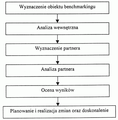 Wyznaczanie obiektu benchmarkingu polega na: wskazaniu przedmiotu analizy, określeniu czynników sukcesu i barier rozwoju firm oraz powołaniu zespołu badawczego. Po wyborze obiektu badania należy wyodrębnić i zanalizować czynniki, które przyczynią się do wzrostu reformowanych procesów, a w rezultacie do większego zadowolenia klienta. Po zdefiniowaniu obszarów, które mają podlegać procesowi benchmarkingu należy powołać zespół badawczy. Członkowie zespołu powinni być tak dobrani, aby posiadać odpowiednią wiedzę potrzebną do przedmiotu analizy. W etapie analizy wewnętrznej należy szczegółowo scharakteryzować obiekt benchmarkingu. Charakterystyka daje materiał do formułowania wniosków odnośnie usprawnienia przedmiotu badań. Ułatwia ona poszukiwanie odpowiedniego partnera i formułowania listy pytań odnoszących się do całego obiektu lub do jego części. Etap następny to wyszukanie partnera benchmarkingu, który mógłby być punktem odniesienia. Porównywanie do takiego partnera umożliwi poznanie różnic występujących między praktyką innych organizacji, a własną organizacją i udzielanie odpowiedzi na pytania, które pojawiły się w poprzednim etapie. W etapie analizy partnera najlepszym sposobem na jego poznanie jest bezpośredni kontakt. W tym celu należy wykorzystać takie techniki badawcze, jak wywiad, okresowe spotkania współpracowników, konferencje z samym partnerem itp. Etap oceny wyników to wartościowanie pozyskanych informacji. Oceny tej należy dokonać z punktu widzenia wiarygodności i porównywalności. Ten etap metody benchmarkingu powinien umożliwić wyrobienie sobie poglądu na to jakie warunki partner musiał spełnić, aby osiągną takie właśnie wyniki. Mając obrany wzorzec, zgromadzone informacje i opisane warunki, które umożliwiły partnerowi odniesienie sukcesu, można przystąpić do ostatniego etapu benchmarkingu - wprowadzenia zmian i doskonalenia. Jeżeli dobrze zrozumiemy odchylenia występujące między procesami przebiegającymi w organizacji partnera i w organizacji naszej, wprowadzającej usprawnienia, to możemy poprawnie sformułować założenia i warunki, które powinny być spełnione, aby proces przebiegał tak, jak u partnera. Na proces benchmarkingu, jako narzędzie doskonalenia działalności organizacji usługowej zwrócono uwagę na początku lat 90. Literatura naukowa podaje, że jednym z pierwszych zainteresowanych był brytyjski The National Health Service.[3] W dziedzinach związanych z bibliotekoznawstwem zainteresowanie benchmarkingiem rozwija się powoli. Jest to niewątpliwie bardzo szkodliwe zjawisko w działalności bibliotek. Benchmarking jest bowiem narzędziem służącym uczeniu się jednej biblioteki od innych. Istnieją bliskie jego związki z teorią uczącej się organizacji. W wyniku wzięcia udziału w procesie benchamrkingu partnerzy zdobywają nową wiedzę i umiejętności, bliżej poznają swoje otoczenie oraz ustalają jakość swojej pracy na tle innych. W wypadku biblioteki możemy w ramach przebiegu procesu benchmarkingu stosować dwa porównania: