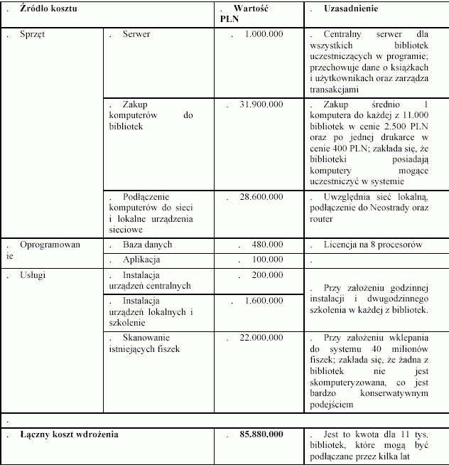 Tab. 1. Analityczne ustalenie kosztów informatyzaji bibliotek publicznych Załączona tabela upewnia, że nie przeprowadzono żadnej analizy dotychczasowych wdrożeń o charakterze bibliotecznym. Zacznijmy od centralnego serwera. Biorąc pod uwagę jego funkcjonalność musiałby to być ogólnopolski, biblioteczny zintegrowany megasystem. Nawet po dodaniu wszystkich kosztów, otrzymamy zaledwie 1.780. 000 PLN. To wielka suma, jednak wdrożenie "zwykłego" systemu w jednej bibliotece akademickiej to koszt ok. 1.000.000 USD, czyli ponad dwuktrotnie więcej! Równie dalekie od realizmu są inne wyliczenia, jednak trzeba pamiętać, że zakłada się iż jest to pierwsze, bardzo zgrubne przybliżenie. O "Skanowaniu istniejących fiszek" litościwie nie wspomnę, gdyż termin retrokonwersja jest pewnie nie znany autorom projektu i szkoda czasu na dyskutowanie, dlaczego jest on lepszy w wypadku centralnego katalogu niż metoda skanowania.