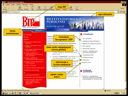 Według Rozporządzenia portal strony głównej BIP - http://www.bip.gov.pl/ składa się m.in. z menu podmiotowego w postaci hierarchicznej listy podmiotów zobowiązanych Ustawą do udzielania informacji publicznej oraz elementów takich, jak: logo Biuletynu, imię i nazwisko, adres, numer telefonu, numer faksu i adres e-mail osób redagujących stronę główną Biuletynu, instrukcja korzystania, informacje o liczbie odwiedzin, rejestr zmian treści strony głównej Biuletynu, ze wskazaniem daty, od której zmiany te obowiązują, oraz wyszukiwarka[17].