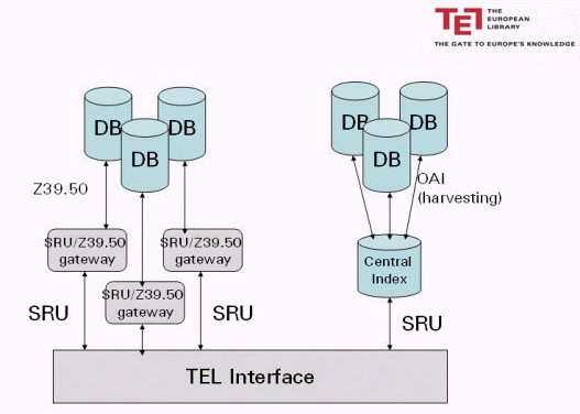 Biblioteka Europejska będzie zintegrowana z serwisem Gabriel: http://www.bl.uk/gabriel/ obejmującym 43 europejskie biblioteki narodowe, reprezentowane w Konferencji Bibliotek Europejskich (CENL). Zadaniem serwisu Gabriel jest dostarczanie informacji o europejskich bibliotekach narodowych, o ich zbiorach oraz usługach, w celu ułatwienia dostępu do nich, a także popieranie rozwoju nowych serwisów powstających w oparciu o wspólną infrastrukturę. Zważywszy na to, że zarówno Gabriel, jak i TEL mają zbieżne cele, współdziałanie serwisu Gabriel z proponowanym serwisem operacyjnym Biblioteka Europejska (TEL) stało się oczywiste. Internetowy serwis TEL (Biblioteka Europejska) adresowany jest do wykształconych ludzi ze wszystkich krajów, którzy szukają skutecznego i łatwego sposobu dotarcia do europejskich sieciowych zasobów kulturalnych. Serwis ten będzie też atrakcyjny dla naukowców ze względu na jego bogate wirtualne zasoby dotyczące wszystkich dziedzin wiedzy. Każda osoba zainteresowana możliwościami tego serwisu będzie mogła w prosty sposób uzyskać dostęp do europejskich zasobów kulturalnych. Rozwiązania techniczneW początkowej fazie projektu, jeśli chodzi o jego stronę techniczną, pojawiła się kwestia różnorodnego dostępu do baz bibliotek uczestniczących w tym projekcie. W niektórych bibliotekach dostęp do danych bibliograficznych zapewniony był poprzez protokół Z39.50, a w innych nie. Ponadto katalogi OPAC tych bibliotek narodowych nie obejmowały wszystkich zbiorów. Pierwszym wytyczonym zadaniem serwisu TEL było znalezienie sposobu na stworzenie wspólnej bazy metadanych dotyczących wszystkich zbiorów oraz zapewnienie możliwości wyszukiwania zintegrowanego. Zbudowano dwa stanowiska testowe. Jedno dotyczące wyszukiwania poprzez protokół Z39.50 oraz drugie dla metadanych niedostępnych poprzez Z39.50, dla których konieczne było użycie innego protokołu. Dla tych właśnie danych zdecydowano wykorzystać Extensible Markup Language (XML) jako strukturę rekordu oraz HTTP (Hypertext Transfer Protocol). Stanowisko testowe Z39.50 zostało zbudowane w Die Deutsche Bibliothek (DDB), a stanowisko testowe HTTP/XML uruchomiła Koninklijke Bibliotheek (KB) w Hadze. Tymczasem firma Open Archives Initiative (OAI) opublikowała protokół Open Archives Initiative dla rozwiązania nazwanego Metadata Harvesting (OAI-PMH). Protokół ten został zaadaptowany przez TEL dla centralnego indeksu zasobów niedostępnych poprzez protokół Z39.50. Stanowisko testowe Z39.50 już udostępniało wszystkie funkcje potrzebne do przeszukiwania i wyszukiwania, podczas gdy stanowisko HTTP/XML nie posiadało funkcji przeszukiwania. Zostało ono uruchomione dopiero po zindeksowaniu metadanych XML oraz zainstalowaniu interfejsu do przeszukiwań. Protokół SRUW czasie gdy w TEL podejmowano decyzję dotyczącą wyboru protokołu do obsługi funkcji przeszukiwania, w ramach inicjatywy ZING (Z39.50 International Next Generation) opracowano nowy protokół do obsługi stron WWW nazwany SRW (Search and Retrieve for the Web). SRW jest protokołem sieciowym, który poprzez stworzenie wspólnej platformy zapewnia zintegrowany dostęp do zasobów sieciowych oraz umożliwia współdziałanie rozproszonych baz danych. Podobnym protokołem jest SRU (Search and Retrieve for the Web using Unified Resource Locators