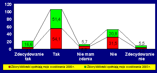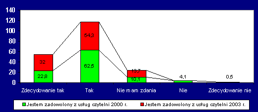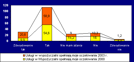 Źródło: Opracowanie własne Wykres 4. Usługi w Wypożyczalni. Równie korzystne rezultaty przynosi odpowiedź na stwierdzenie: Usługi w Wypożyczalni spełniają moje oczekiwania. Mimo trudnej sytuacji finansowej biblioteki w ostatnich latach i prowadzenia ograniczonego zakupu nowości wydawniczych, a przede wszystkim ograniczonej ilości egzemplarzy podręczników bardzo cieszy fakt, że użytkownicy bardziej pozytywnie oceniają usługi w Wypożyczalni w 2003 r. niż w latach poprzednich. Warunki korzystania z Wypożyczalni znacznie się poprawiły z chwilą przeniesienia jej do wyremontowanych, przestronnych i nowo wyposażonych pomieszczeń. Wszystkie dodatkowo pozyskane środki finansowe, np. z tytułu pobierania opłat za nieterminowe zwroty, umów zawartych ze szkołami prywatnymi, są przeznaczane na zakup nowości wydawniczych i na zwiększanie liczby egzemplarzy najbardziej poszukiwanych tytułów do Wypożyczalni. WnioskiWyniki uzyskane w przeprowadzonych w 2000 i 2003 r. badaniach ankietowych potwierdzają obserwacje pracowników Biblioteki Głównej, iż bardzo istotne jest to, co biblioteka ma do zaoferowania swoim czytelnikom, ale również ważne są warunki korzystania z zasobów zgromadzonych w bibliotece. Przestronne, jasne, wyposażone w nowe meble pomieszczenia sprawiają, że użytkownicy chętniej przychodzą do Biblioteki Głównej Uniwersytetu Szczecińskiego. Coraz częściej można zauważyć czytelników uczących się na korytarzach, w przystosowanych do tego celu "kącikach". Znacznie chętniej wykorzystywane są komputery i to zarówno do poszukiwania literatury w lokalnym systemie BIBLIO-INFO, jak i poprzez Internet. Coraz większym zainteresowaniem, choć ciągle jeszcze nie takim, jak powinny, cieszą się elektroniczne bazy danych udostępniane lokalnie, jak i sieciowo. Nasi czytelnicy, odpowiadając na pytania zadane w ankiecie w 2003 r., mieli również możliwość szerszego wypowiedzenia się na temat usług oferowanych przez naszą bibliotekę. Wśród uwag powtórzyły się te, które uzyskaliśmy w ankiecie w 2000 roku.