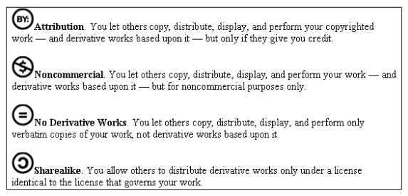 Attribution (by): Wolno kopiować, rozprowadzać, przedstawiać i wykonywać objęty prawem autorskim utwór oraz opracowane na jego podstawie utwory zależne pod warunkiem, że zostanie przywołane nazwisko autora pierwowzoru. Noncommercial (nc): Wolno kopiować, rozprowadzać, przedstawiać i wykonywać objęty prawem autorskim utwór oraz opracowane na jego podstawie utwory zależne jedynie dla celów niekomercyjnych. No Derivative Works (nd): Wolno kopiować, rozprowadzać, przedstawiać i utwór jedynie w oryginalnej postaci - tworzenie utworów zależnych nie jest dozwolone. Sharealike (sa): Wolno rozprowadzać utwory zależne jedynie na licencji identycznej do tej, na jakiej udostępniono utwór oryginalny. Każda licencja zawiera krótki, niezakodowany tekst nazwany Commons Deed, informujący o warunkach licencji skierowany do użytkownika końcowego, dokument dotyczący pełnej licencji opisujący warunki zgodne z prawem, a także metadane dotyczące praw własności, odczytywalne komputerowo, udostępniane w RDF/XML. Pomimo tego, że początkowo opracowano "doskonale pasujące" rozwiązanie dotyczące praw do metadanych, chroniące prace naukowe, w którym używano języka ODRL (Open Digital Rights Languge)[15], to widząc, z jak wielkim rozmachem rozwija się projekt Creative Commons, doszliśmy do wniosku, że należy uznać to rozwiązanie za alternatywną wersję prawnej ochrony metadanych. Kierując się wynikami sondażu, uznaliśmy, że rozwiązanie opracowane przez Creative Commons w sposób wystarczający chroni prace naukowe dostępne w modelu open access, a dodatkową korzyścią byłoby stałe wsparcie ze strony CC udzielane także po zakończeniu projektu RoMEO, co nastąpi we wrześniu 2003 r. W momencie rozważania, jak rozwiązać sprawę ochrony metadanych, okazało się, że również licencje CC najwyraźniej spełniają wymagania określone w sondażach przeprowadzonych wśród dostawców danych i usług. Są to: wymóg atrybucji, zakaz niekomercyjnego użytku oraz zgoda na rozpowszechnianie dzieł zależnych na zasadzie "sharealike" albo całkowity zakaz udostępniania dzieł zależnych. Licencje CC chroniące metadane na bazie protokołu OAI-PMHZastanawialiśmy się, jak najlepiej przedstawić CC informację o prawach własności wynikających z licencji CC tworzoną pod rządami protokołu OAI-PMH. Pojedyncze rekordy metadanych Dzięki parametrom protokołu OAI-PMH każdy rekord metadanych może mieć dodatkowo kontener <about>, który może, między innymi, służyć do przechowywania informacji o prawach autorskich dotyczących samego rekordu metadanych. Protokół nie określa, jak to ma działać, jednak zakłada, że zawartość wszystkich kontenerów <about> musi być zgodna ze schematem XML. Początkowo wystąpił problem polegający na tym, że chociaż CC zapewnia w ramach pakietu licencji odczytywalne komputerowo metadane, mówiące o prawach własności, to zapisane są one w formacie RDF/XML, który jak dotąd nie ma schematu XML (XML Scheme). Na szczęście, w wyniku pomyślnych negocjacji z CC, organizacja ta zgodziła się opracować schemat XML dla ich formatu RDF. Prace powinny być zakończone do września 2003 r., a po tym terminie zostaną opublikowane. Zaproponowaliśmy inne rozwiązanie, mianowicie stworzenie różnych wersji jedenastu licencji CC w języku ODRL, wykorzystując format XML, które byłyby zgodne z wcześniej opracowanym schematem ODRL XML. Zbiory metadanych Opis statusu własnościowego całego zbioru rekordów metadanych zależy od wszystkich rekordów odnoszących się do danej informacji o prawach własności. Jest to sprawa prosta, jeśli jest jeden właściciel praw autorskich do wszystkich rekordów (np. konkretny dostawca danych), ale nie jest to takie proste, jeśli jest wielu właścicieli (np. autorów). W odpowiedzi na OAI-PMH Identify verb, dostawcy danych mogą dodatkowo dostarczyć <opis> swojego repozytorium (archiwum). Także w tym przypadku, zawartość takiego kontenera musi być zgodna ze schematem XML. Opracowano schemat opisujący zawartość repozytorium druków elektronicznych (Schemat XML do opisu zawartości i zasad odnoszących się do repozytoriów druków elektronicznych[16]), który umożliwia dodanie dodatkowego elementu nazwanego <metadataPolicy>, który może zawierać takie elementy jak: <tekst> i/lub <URI>. Proponujemy, aby w elemencie <tekst> znalazło się stwierdzenie, że wszystkie rekordy znajdujące się w tym repozytorium (mającym określoną nazwę) są zgodne z daną licencją CC, a także to, że w elemencie <URI> znajduje się albo URI odpowiedniego zapisu warunków licencji nazwanych Commons Deed (który z kolei opiera się na regulacjach prawnych albo URI generic RDF/XML instance danej licencji). ZamierzeniaJak rozwiązać problem wspólnych praw własności dostawcy danych i usług, to zagadnienie, które nie zostało uwzględnione w projekcie RoMEO. Jeśli dostawca danych zezwala dostawcom usług na gromadzenie swoich metadanych, a także na rozbudowywanie i ponowne "udostępnianie" ich w ramach innej licencji niż ich własna, wcześniej uzyskana licencja, to jak wtedy powinna być sprecyzowana umowa dotycząca wspólnych praw autorskich? Taka sytuacja może być coraz bardziej skomplikowana, ponieważ coraz więcej dostawców usług gromadzi metadane, a także rozbudowuje je i ponownie "udostępnia". Może się okazać, że po rozpowszechnieniu przez nas naszych propozycji wynikających z przeprowadzonych przez nas badań, pojawią się inne problemy. Jednak na tym etapie istotne jest to, że zaproponowano pewien sposób ochrony, nad którym można dyskutować, a także na nim bazować. Idąc w tym kierunku, w ramach projektu RoMEO rozważana jest obecnie sprawa współpracy z OAI, która miałaby na celu opracowanie dokumentacji oraz wytycznych dotyczących udostępniania informacji o prawach własności (zarówno o metadanych, jak i o zasobach) na bazie protokołu 