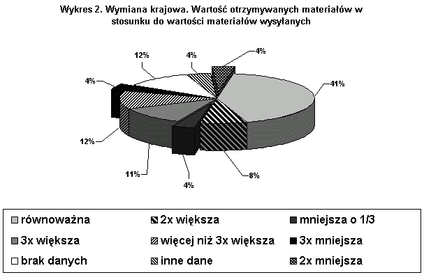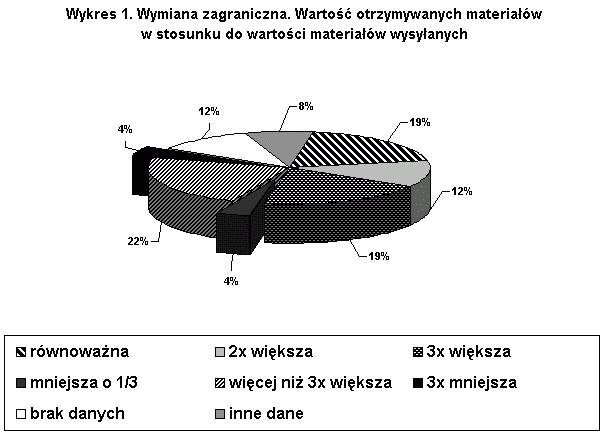 Wiele ankietowanych instytucji wyrażało opinię o finansowej opłacalności wymiany wydawnictw. Zwracano uwagę na proporcje pomiędzy wartością wysyłanych a otrzymywanych publikacji. Są biblioteki, które nie prowadzą statystyki finansowej, inne czynią to bardzo skrupulatnie. Ankietowani odpowiedzieli na zadane pytania w sposób wyczerpujący. Niektóre wypowiedzi były szczególnie cenne, wzbogacone swobodnym komentarzem. Były i takie, na które odpowiedziano w sposób niekompletny, z pominięciem niektórych pytań. Na 26 bibliotek, z których otrzymano odpowiedzi (100%), wszystkie prowadzą wymianę krajową i zagraniczną z wyjątkiem Akademii Rolniczej w Poznaniu, która w 2000 r. zawiesiła prowadzenie wymiany zagranicznej ze względu na zbyt wysokie opłaty pocztowe. Liczba kontrahentów zawiera się w przedziale od jednego do kilkudziesięciu lub więcej, np. 405 (Akademia Rolnicza w Lublinie). Ankietowanych pytano o to, jaki procent rocznych przybytków stanowią materiały otrzymywane w drodze wymiany, osobno dla krajowej i zagranicznej. W tym przypadku zbiór odpowiedzi był zróżnicowany. Rozpiętości danych nie da się w żaden sposób ujednolicić, co świadczy o bardzo indywidualnym charakterze wymiany dla każdej jednostki. Wydawać by się mogło, że roczny procent przybytków może zależeć od liczby kontrahentów. Zdarza się, że 1% jest relatywny zarówno dla 1, jak i dla 4, 21 czy 28 kontrahentów w pojedynczych przykładach, a 89% lub 80% odpowiednio dla 98 i 130 kontrahentów zagranicznych. Dla wymiany krajowej proporcje też są zróżnicowane i w żadnym przypadku się nie powtarzają. Przykładowo: 8% jest osiągane w wymianie mającej zarówno 3, jak i 80 kontrahentów, a wyższe wartości odpowiednio: