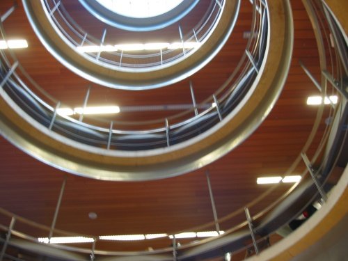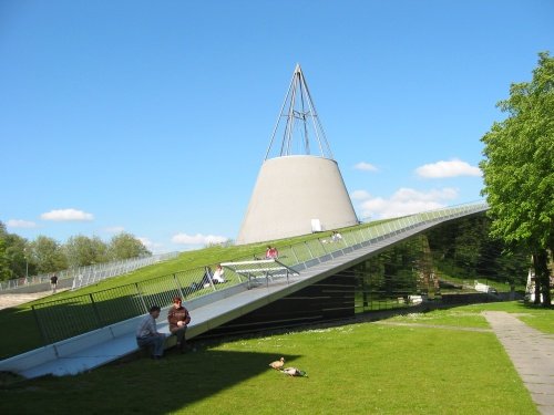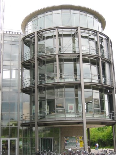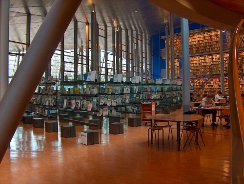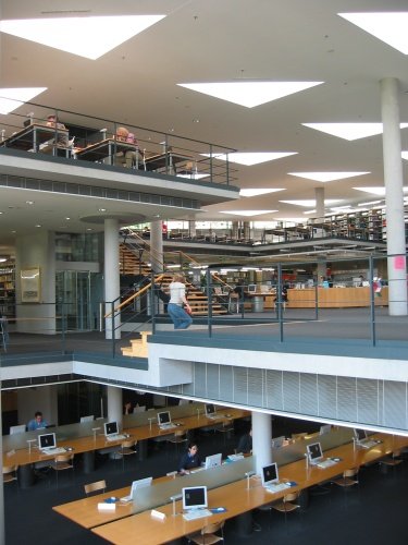 Budowa biblioteki została zakończona w 1997 r. Niesamowite wrażenie w tym budynku robi ogromna masa ziemi przykrywająca jeszcze większą masę książek. Konstrukcja budynku opiera się na wspornikach wystającego stożka i aż trudno uwierzyć, iż galeria książek w wolnym dostępie to wisząca ekspozycja. Konstrukcja budynku sprawia wrażenie lekkości i przejrzystości, wykorzystanie odpowiedniej kolorystyki oraz połączenie szkła i metalu potęguje wrażenie lekkości.