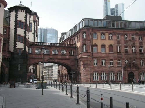 Opuściliśmy bibliotekę, udając się na zwiedzanie starego miasta we Frankfurcie. Dotarliśmy metrem do Kościoła św. Bartłomieja. Frankfurt nie oferuje zbyt wiele zabytków. Miasto ma bardzo długą historię, ale niestety, zostało poważnie zniszczone w czasie wojny. Po wojnie zaś nikt nie myślał o odbudowie pięknych kamienic i pałaców. Stąd nawet rynek, zwany "Römer", to dekoracja teatralna, bo kilka naprawdę pięknych budynków to zbudowane od podstaw atrapy. Ogromne wrażenie sprawia widok wyrastających ponad dachami starego miasta, szklanych wieżowców, będących siedzibami największych banków. To połączenie tradycji i nowoczesności oddaje charakter tego miasta.