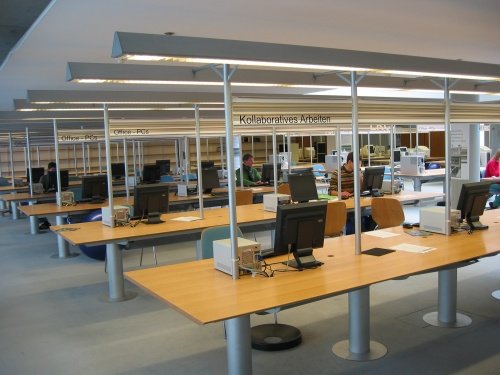 Poszczególne miejsca pracy użytkowników płynnie się uzupełniają, dając z jednej strony możliwość dotarcia do informacji, z drugiej tworząc intymną atmosferę pracy. Część przeznaczona dla użytkowników została tak zaprojektowana, by umożliwiać wzajemny kontakt wzrokowy pomiędzy personelem a użytkownikami oraz pomiędzy samymi użytkownikami.