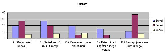 A / Czy do rozumienia obrazów potrzebna jest znajomość kodów: 1 - jest niezbędna; 2 - nie, ważniejsza jest indywidualna percepcja; 3 - nie, przekaz obrazu jest oczywisty Ważne jest porównanie problemów prezentowanych w kolumnach A i E powyższego wykresu. Respondenci uważają, że do zrozumienia obrazu nie jest konieczna znajomość kodów, czyli obraz jest o wiele łatwiejszy w odczytaniu i zrozumieniu niż język mówiony i pisany, który przy nieznajomości reguł nim rządzących staje się kompletnie niezrozumiały. Zdanie takie wyraża ok. 50% badanych, ale na pytanie o przygotowanie do odbioru obrazu wirtualnego zdecydowana większość odpowiada, że widz przygotowany jest tylko częściowo - czyli uznaje jednak, iż przygotowanie to jest potrzebne. Dzieje się tak dlatego, że respondenci zdają sobie sprawę z możliwości konstruowania nierzeczywistych przedstawień przy pomocy wyrafinowanej techniki. Zestawienie B i C wskazuje na potrzebę odwołania się do trwałych podstaw informacji. Autor obrazu powinien świadomie adresować wiadomości do użytkownika. Jako ważny etap w tworzeniu współczesnego obrazu została wskazana fotografia, która do niedawna spełniała funkcje dokładnego zapisu rzeczywistości i była traktowana jako dowód na zarejestrowaną (prezentowaną) sytuację. Kategoria D opisuje determinanty mające wpływ na formę i treść obrazów. Jako dwa wyróżniki dające się wydzielić w sposób zdecydowany (spośród wielu innych) występują: zapotrzebowanie płynące ze strony otoczenia społecznego i komercja. Oba czynniki należą w gruncie rzeczy do tej samej grupy warunków - współczesna forma obrazu jest odpowiedzią na potrzeby percepcyjne odbiorców i finansowe twórców.