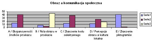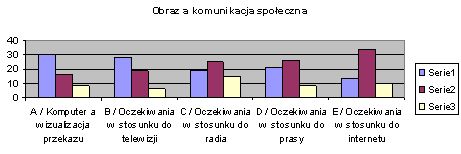 A / Znajomość obsługi komputera: 1 - ułatwia poznanie procesów wizualizacji przekazu; 2 - pozwala kreować przekazy; 3 - stwarza jedynie pozory uczestnictwa W pierwszej części badań odnoszących się do wpływu obrazu na komunikację społeczną została dokonana analiza oczekiwań i potrzeb użytkowników w stosunku do nowoczesnych środków przekazu. Komputer zyskał uznanie jako doskonałe narzędzie poznania wszystkich procesów związanych z wizualizacją przekazów informacyjnych oraz edytowaniem wiadomości przez użytkowników. Następne 4 pytania były związane z oczekiwaniami wobec środków przekazu (mas-mediów). Jako przykład tych oczekiwań wymieniono: informację, edukację, uczestnictwo w kulturze, rozrywkę. Oczekiwania dotyczące wszystkich wymienionych aspektów łącznie zostały wyrażone najsilniej w stosunku do tych mediów, w których obraz jako nośnik informacji odgrywa ważną rolę, tj. w stosunku do telewizji i prasy. Oczekiwania stricte informacyjne natomiast były formułowane w sposób wyraźny w stosunku do wszystkich mediów, ze szczególnym wskazaniem na Internet. Tak powszechnie wyrażana potrzeba dostępu do informacji potwierdza adekwatność nazwy cywilizacja informacyjna - opisującej atrybuty współczesnej nam epoki.
