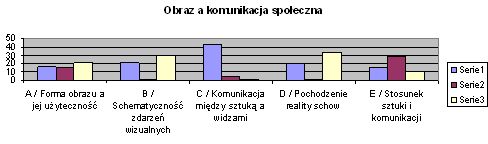 A / Skomplikowana forma obrazu w komunikacji jest: 1 - nieużyteczna; 2 - rodzi kontrowersje; 3 - potrzebna, gdyż różnicuje poziom Wypowiedzi respondentów zilustrowane wykresem nr 6 odnoszą się do form komunikatów wizualnych i skutków, jakie formy te rodzą dla kultury. Tylko 40% badanych dopuszcza możliwość, aby obraz używany w komunikacji mógł mieć skomplikowaną, niejednoznaczną formę. Jest to w przybliżeniu ta część respondentów, która we wcześniejszych pytaniach wskazywała na potrzebę uczenia się odbioru obrazów. Większość badanych uważa, że obraz powinien być prosty i oczywisty. Pogląd ten współbrzmi z wcześniejszą deklaracją braku potrzeby edukacji w zakresie rozumienia przedstawień wizualnych. W procesach komunikacyjno-informacyjnych (np. w wiadomościach radiowych czy telewizyjnych) dość powszechnie jest stosowana metoda powtarzania w sposób cykliczny całych zbitek informacyjnych. Formę tę respondenci uważają za dopuszczalną. Powodem aprobaty jest to, że odbiorca komunikatów uczy się takiego systemu perswazji i potem go stosuje w relacjach ze swoimi słuchaczami i odbiorcami. Odpowiednio spreparowany komunikat powtarzany w tzw. "krótkich bitowych wejściach" bardzo dobrze zapisuje się w pamięci. Bardzo istotny według autora jest problem wzajemnych relacji między sztuką a komunikacją społeczną. Większość respondentów (55%) wyraziło pogląd, że sztuka i komunikacja zbliżają się do siebie coraz bardziej. Sztuka splata się z codziennością, skutkiem czego w otaczającej rzeczywistości coraz bardziej powszechny jest kicz - czyli bezstylowość oraz pomieszanie pojęć i wartości. Diagnoza ta znajduje się w kolizji ze stosunkiem uczestników badań do źródeł tego procesu. Na pytanie o ocenę działań artystów uwzględniających w swych dziełach postulaty odbiorców - zdecydowana większość respondentów poparła taki sposób tworzenia. Badani uważają, że czynności podejmowane w interesie widzów są gestami pozytywnymi i nie powinny być uznawane jako działanie na rzecz pierwiastka profanum. Jako dodatkowe (w tej części ankiety) zostało zadane pytanie o pochodzenie terminu "Big Brother". Większość badanych - 62% odpowiedziało trafnie, że jest to termin przejęty z klasyki literatury. Odsetek odpowiedzi poprawnych w badanej populacji jest bardzo wysoki w stosunku do innych środowisk. Autor pozwolił sobie pytać o to w innych (reprezentatywnych) grupach, gdzie prawidłowe odpowiedzi wynosiły ok. 30%. Świadczy to niewątpliwie o tym, że środowisko bibliotekarzy jest nieco bardziej tradycyjne niż pozostała część społeczeństwa. Podstawowe wzorce kulturowe tej grupy są osadzone w większym stopniu w kontekście słowa niż obrazu. Należy o tym pamiętać przy formułowaniu końcowych ocen - wpływ wizualizmu na modelowego członka naszego społeczeństwa jest większy, niż wynikać to będzie z przeprowadzonych tu badań. Wnioski: