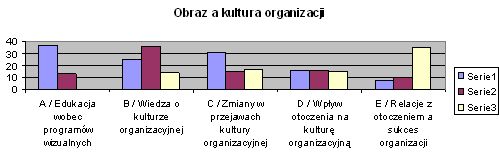 A / Czy do uczestnictwa w kulturze wizualnej potrzebna jest edukacja?: 1 - tak; 2 - nie Interesujących wiadomości dostarcza porównanie odpowiedzi udzielonych na podobnie sformułowane pytania odnoszące się do percepcji przekazu wizualnego. Wykres 2, kat. A (pierwsza część badań) przedstawia stanowisko badanych na temat uwarunkowań koniecznych do rozumienia obrazów. Zdecydowana mniejszość opowiada się za koniecznością edukacji w tym kierunku. Większość - ok. 65% takiej potrzeby nie widzi. Podobne pytanie zostało postawione w trzeciej części badań. Wykres 7, poz. A prezentuje wypowiedzi respondentów odnoszące się do zasadności edukacji dla właściwego uczestnictwa w kulturze obrazowej. W tym przypadku prawie 70% opowiedziało się za koniecznością edukacji w tym kierunku. Pytanie o wartość, jaką przedstawia znajomość kultury organizacyjnej, zostało odebrane przez respondentów w sposób jednoznaczny. Nikt z badanych nie miał wątpliwości, że świadomość istnienia kultury organizacyjnej ma kapitalne znaczenie dla pełnoprawnego uczestnictwa w organizacji. W ramach odpowiedzi dotyczących tego problemu najczęściej był dokonywany wybór wielu wariantów odpowiedzi, tzn. większość badanych wskazywała na to, że istotna jest zarówno świadomość istnienia kultury organizacji, jak też ważna jest wiedza członków o własnym wpływie na tworzenie kultury organizacyjnej, oraz to, że wiedza o tejże kulturze wpływa na poczucie autentycznej przynależności do grupy, co w dzisiejszych czasach dość powszechnego wyalienowania jednostek jest szczególnie ważne. Zmiany w kulturze organizacyjnej zaobserwowane przez respondentów na poziomie zewnętrznych jej atrybutów - tj. prezentacji wizualnej i stylu działania - to przede wszystkim te artefakty, które tworzą kompleksowy wizerunek instytucji. Są to wszystkie jej zewnętrzne określniki, jak np.: kolorystyka; logo; stroje; aranżacja otoczenia, fasad i wnętrz siedzib firm; typ zachowań członków, na który składają się m.in. układ ciała, gestykulacja, mimika itp. W powszechnym dążeniu do perfekcyjnego tworzenia wizerunku zewnętrznego świata organizacji można zaobserwować analogie do tych uwarunkowań, które legły u podstaw kultury masowej. Zabieganie o to, aby podobać się za wszelką cenę, prowadzi do braku wyrazistych różnic - wszystko staje się bardzo dobrze skomponowane, dobrane kolorystycznie i zgodne z panującą modą. Natomiast zauważalne zmiany w stylu działania, to wzrastająca rola liderów, którzy coraz powszechniej są utożsamiani z sukcesem (lub porażką) organizacji. Bardzo ważne jest zestawienie ocen problemów prezentowanych w części D i E wykresu 7. Respondenci analizując wpływ kultury wizualnej na otoczenie kulturowe organizacji, oceniają, że kultura obrazowa pomaga organizacjom silnym kreować własne wzorce i narzucać je otoczeniu. Tylko 30% badanych dostrzega takie działania organizacji, które mają za zadanie utworzenie z lokalnym otoczeniem wspólnot kulturowych. W ocenie badanych proporcje winny ulec odwróceniu - 66% respondentów uważa, że najważniejsze dla organizacji (dla jej rozwoju) jest uwzględnianie w zmianach strukturalnych tych wzorców, które są ważne dla środowisk lokalnych. Najmniej zwolenników ma unifikacja kulturowa oparta o standardy globalne.