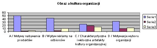 A / Główne motywy nabywania konkretnych produktów to: 1- własna opinia o produkcie; 2 - moda; 3 - marka Wykres 8 jest dowodem na to, jak bardzo skomplikowany jest otaczający nas świat organizacji. Przejawem tej złożoności jest chociażby brak rozeznania w tym, co jest przyczyną, a co skutkiem działań i zachowań jednostek zmuszonych do ciągłego, interakcyjnego kontaktowania się z różnego typu instytucjami. Komunikowanie się organizacji ze swymi klientami za pomocą przekazów obrazowych wytwarza w odbiorze tych drugich ustawiczny chaos. Występuje coraz bardziej powszechna nieumiejętność rozróżniania - między oceną własną a narzuconą z zewnątrz. Deklarowane przez badanych motywy nabywania produktów (wytworów działalności organizacji) są określane jako własne potrzeby poparte własnymi opiniami o nabywanych wyrobach. Twierdzi tak 90% respondentów. Niewiele mniej, bo prawie 80% uważa, że reklama we współcześnie obowiązującej formie ma zdecydowanie ujemny wpływ na odbiorców (ujemne oddziaływanie społeczne; ujemny wpływ na inteligencję, kreatywność, język itp.). Jednocześnie 80% badanych wybiera jako swego kontrahenta te organizacje, które zna z funkcjonujących w otoczeniu opinii oraz na podstawie zewnętrznych atrybutów. Świadczy to o zdecydowanym niedocenianiu wpływu reklamy na własną świadomość. Deklarowany własny wybór na podstawie własnej oceny, absolutnie nie współgra z wpływem na tenże wybór obiegowych opinii, gdyż te mają bezwzględne odniesienie do wszechobecnego agresywnego marketingu. Taka ocena zachowań znajduje potwierdzenie w wypowiedziach respondentów opisujących najbardziej zauważalne artefakty kultury organizacyjnej. Obserwacje te są zbieżne z omawianymi wcześniej zmianami w tej kulturze. Odnoszą się one do skłonności organizacji w modelowaniu otoczenia i wszystkich widocznych elementów, tj. również stylów i sposobów działania, zwyczajów i zachowań, a także produktów. Wnioski: