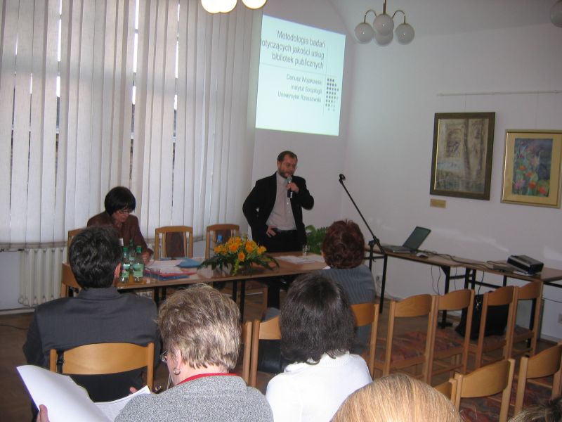 Następny referat pt. Metodologia badań dotyczących jakości usług bibliotek publicznych zaprezentował dr Dariusz Wojakowski z Instytutu Socjologii Uniwersytetu Rzeszowskiego. Omówił on najważniejsze problemy badawcze w zakresie mierzenia jakości usług bibliotek publicznych w ramach ich ustawowej działalności oraz metody zdobywania i sposoby analizy danych charakteryzujące te problemy. Jego zdaniem badania tego typu mogą służyć bibliotece publicznej do rozpoznawania potrzeb środowiska w zakresie usług prowadzonych przez nią, planowania nowej działalności usługowej oraz kontroli i podnoszenia jakości oferowanych usług.
