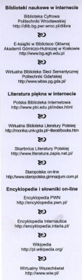 Bibliografia1. GROCHOLSKA, B. Stąpam po chmurach. In Biuletyn EBIB [on-line]. 2005, nr 6 [dostęp 8 listopada 2005]. Dostępny w World Wide Web: http://ebib.oss.wroc.pl/2005/67/grocholska.php. 2. JUROWSKI, M. Działalność promocyjna Biblioteki Politechniki Wrocławskiej wśród potencjalnych użytkowników. Bibliotekarz 2002, nr 10, s. 18-24. 3. Liczą się pasjonaci i pomysły. Rozmowa z prof. Magdaleną Fikus, organizatorem Festiwalu Nauki w Warszawie. Forum Akademickie 2005, nr 7-8, s. 66-68. 4. MOSKWA, K. Dolnośląski V Festiwal Nauki w Bibliotece Głównej i OINT. Pryzmat 2002, nr 159, s. 52. Linki |