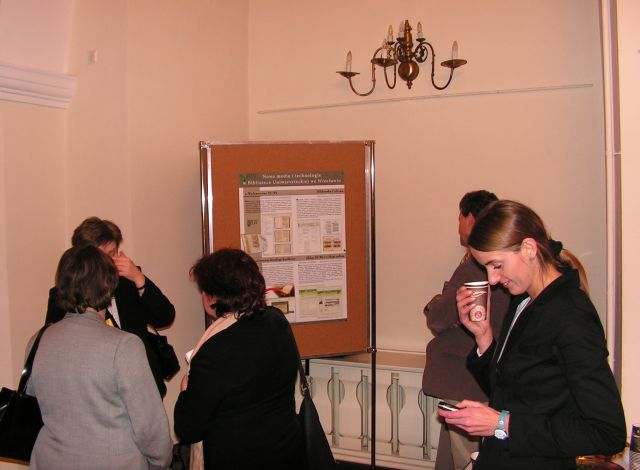 Wygłoszone w pierwszym dniu referaty spotkały się z dużym zainteresowaniem i żywą reakcją uczestników konferencji. Dyskusja na temat pozyskiwania środków unijnych na tworzenie zasobów cyfrowych, gorąco propagowanego przez Bożenę Bednarek-Michalską, stała się punktem wyjścia do rozważań na temat polityki (a raczej jej braku) finansowania bibliotek cyfrowych w naszym kraju. Temat ten przewijał się w rozmowach uczestników konferencji do końca obrad. Dzień pierwszy zakończył się tradycyjnym już bankietem w restauracji hotelu Maria Magdalena, gdzie kontynuowano rozpoczęte dyskusje, rozważając możliwość współpracy przy digitalizacji i udostępnianiu zasobów elektronicznych z firmami komercyjnymi, których przedstawiciele licznie uczestniczyli w konferencji. Drugi dzień konferencji poświęcono metodyce tworzenia zasobów cyfrowych. Sesję prowadził prof. Mirosław Górny (Uniwersytet im. Adama Mickiewicza w Poznaniu). Omawiano problemy związane z budową i funkcjonowaniem repozytoriów internetowych. Mówiono m.in. o funkcjonowaniu Wielkopolskiej Biblioteki Cyfrowej, Biblioteki Wirtualnej Nauki i Polskiej Biblioteki Internetowej. Referaty wygłosili: Marcin Werla (Poznańskie Centrum Superkomputerowo-Sieciowe), prof. Marek Niezgódka (Uniwersytet Warszawski), Przemysław Szymański (MSWiA). Wysłuchano również gościa z zagranicy Ingrid Töteberg, która przedstawiła działającą w Niemczech Digitale Bibliotek. Część „poobiednia” przeznaczona była na sesję posterową, którą poprowadził dr Aleksander Radwański. Prezentacja Marcina Werli poświęcona programowi dLibra, będąca uzupełnieniem przedpołudnowego referatu, wzbudziła duże zainteresowanie, także dlatego, że w oparciu o ten program powstają już kolejne biblioteki (ostatnio np. Kujawsko-Pomorska Biblioteka Cyfrowa). Elektroniczne zasoby swoich bibliotek przedstawiali także: Tomasz Kalota mówiący o nowych technologiach stosowanych przez Bibliotekę Uniwersytecką we Wrocławiu, Urszula Poślada z UMCS (o informacji cyfrowej w bibliotekach akademickich) oraz panie: Regina Rohleder i Sylwia Darowna z Politechniki Wrocławskiej w wystąpienu o zasobach Dolnośląskiej Biblioteki Cyfrowej.
