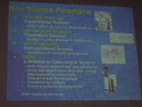 Jednym z nowszych i ważniejszych zagadnień dyskutowanych w Bielefeld, które zdecydowanie nie były do tej pory domeną działania bibliotek, jest wspomaganie eScience. Niezwykle interesujące wykłady dotyczące tego tematu pokazały, że na naszych oczach rodzi się nowy sposób uprawiania nauki, nauki mocno wspieranej przez technologie, które potrzebują - dla przetwarzania informacji i głębokich analiz - milionów danych, danych różnorodnych (pomiarów, fotografii, analiz chemicznych, próbek, kodów cząstek). Dane te trzeba zbierać, porządkować, opracowywać i przechowywać. Kto ma to robić? Bibliotekarze czy uczeni? Czy może jedni i drudzy? Trzeba je zabezpieczać dla obecnych i przyszłych badań. Zastanawiano się nad problemami: jaki wpływ ma biblioteka na stan badań danej uczelni, czy badania mogłyby być prowadzone bez biblioteki? Gdzie są zbierane dane prymarne i czy możemy w tym pomóc? Do tej pory katalogowaliśmy i zbieraliśmy tylko drukowane materiały, co nas czeka w przyszłości, czy jesteśmy przygotowani na przyjście wirtualnych laboratoriów? Musimy sobie odpowiedzieć, na ile spełniamy oczekiwania uczonych (Liz Lyon, Director, UKOLN, University of Bath, UK, E-Science and the Role of Libraries, Tony Hey, Corporate Vice President of Technical Computing, Microsoft Inc., U.S. E-Science and its Implications for the Library Community).