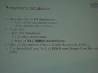 Innym elementem istotnym jest integrowanie narzędzi wyszukiwawczych (multiwyszukiwarki) i integrowanie zasobów (Anurag Acharya, Principal Engineer, Google Inc., U.S., Searching Scholarly Literature: A Google Scholar Perspective), ale także tworzenie wyrafinowanych metod przeszukiwania (Semantyczny Web). Chodzi o to, żeby z jednego miejsca można było przeszukiwać różnego typu zasoby, nie tylko tekstowe. Niezwykle ciekawy był referat o "ukrytym Internecie", którego autor przeprowadził badania naukowe i podał kilka ważnych danych statystycznych pokazujących, że tak naprawdę to, co teraz jest przeszukiwane i widoczne w sieci, stanowi ułamek tego, co sieć naprawdę oferuje. Już dziś jest to gigantyczny zasób, nad którym nie sposób zapanować. Jedno jest w tym wszystkim pocieszające, że pracy bibliotekarzom nie zabraknie, byleby tylko chcieli zamienić się w cyberbibliotekarzy i dostrzec ową szansę zawodową (Dirk Lewandowski, Project Manager, Search Engine Quality, Department of Information Science, Heinrich-Heine-University Düsseldorf, Exploring the Academic Invisible Web).