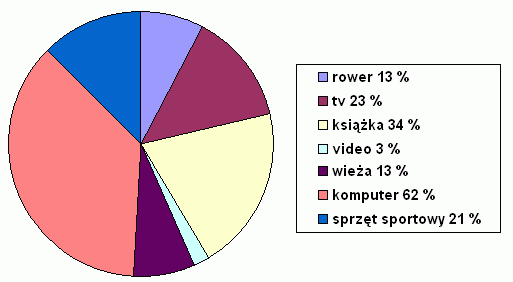 Tabela 13. Tytuły ulubionych czasopism *(wymieniono tytuły 10 najpopularniejszych czasopism; pozostałe uzyskały poniżej 6 głosów) W rankingu przeważają czasopisma o tematyce związanej z modą, muzyką współczesną, plotkami z życia sławnych ludzi, poradami dla młodych dziewcząt. Niepokojący jest fakt, iż większość tytułów docelowo przygotowywana jest dla młodzieży starszej niż badana grupa wiekowa. Nie są one dostosowane do rozwoju emocjonalnego dzieci. Nie przekazują odpowiednich wartości moralnych, etycznych. Pozbawione są także, w większości, informacji kulturalnych i popularnonaukowych, wskazanych dla młodych czytelników. Duży wpływ na zakup tych czasopism ma marketing wydawców, którzy do kolejnych pozycji dołączają różnego rodzaju prezenty, np. płyty, breloczki, naklejki. W sondażu zapytano również, którą z siedmiu sugerowanych rzeczy respondenci kupiliby w pierwszej kolejności, a które w następnej. Najczęstszym zakupem w pierwszej kolejności (wykres 1.) byłby komputer. Następnie książka, telewizor, sprzęt sportowy, rower, wieża i wideo. Za pozytywne zjawisko można uznać, iż książkę jako pierwszy zakup wskazywało aż 34% badanych, 26% wybrało ją na drugim, a 22% na trzecim miejscu. Możemy zatem uznać, że wbrew przyjętym opiniom młodzi czytelnicy doceniają wartość książki. Dostrzegają w niej swojego przyjaciela, sojusznika.