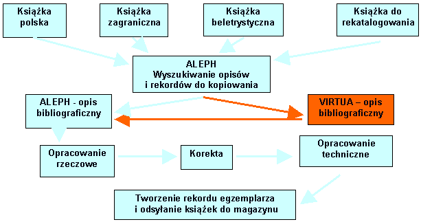 Studenci, realizując wymieniony program, mają okazję opracować kilka książek (opis bibliograficzny, przedmiotowy, khw, opracowanie techniczne, rekord egzemplarza, przygotowanie egzemplarzy do odesłania do magazynów) i zapoznać się z drogą, którą książka pokonuje w procesie opracowania. Schemat obiegu książki podczas opracowania![]() Zadanie pracowników Oddziału polega na tym, aby pokazać jak najwięcej w sposób najbardziej atrakcyjny. Szalenie praktyczne są tu słowa Stefana Kisielewskiego: Możesz swoich słuchaczy zainteresować, rozbawić, ostatecznie rozzłościć, ale na miłość boską nie zanudzaj ich! Studenci są zapoznawani z pracą w Oddziale, towarzysząc stałym pracownikom, następnie próbują samodzielnie wykonywać część obowiązków na przygotowanym dla nich stanowisku komputerowym. Tam, pod okiem bibliotekarzy, katalogują swoje pierwsze książki, tworząc rekordy bibliograficzne, kopiując z bazy NUKAT bądź przygotowując je w systemie ALEPH. Zapoznają się również z zasadą tworzenia rekordów kartotek haseł wzorcowych. Uczą się, jak je pobierać z centralnej kartoteki w NUKAT, następnie korygować lokalne dane i scalać w jedną poprawnie zbudowaną kartotekę formalną. Jak pokazano na schemacie obiegu książki podczas opracowania w Oddziale prowadzi się również opracowanie rzeczowe dokumentów, tworząc hasła według języka haseł przedmiotowych BGiOINT. Są one kontrolowane za pomocą kartotek haseł wzorcowych. Na tym stanowisku studenci są informowani o strukturze naszego języka i zasadach tworzenia charakterystyki rzeczowej dokumentów. Jest też stosowana reguła samodzielnej praktyki poza systemem i wspólne wprowadzanie danych z pracownikiem Oddziału. Z obserwacji wynika, że studenci najbardziej zainteresowani są pracą w systemie komputerowym. Należy podkreślić, iż posiadają umiejętność sprawnej obsługi komputera, a zapoznanie się z pracą programów bibliotecznych przychodzi im łatwo. Nieco więcej problemów mają ze znajomością formatu MARC 21, stosowaniem zasad opisu bibliograficznego oraz kartotekami haseł wzorcowych. Zatrudnianie studentówInną formą współpracy ze studentami jest zatrudnianie ich na umowę zlecenie w określonych dniach i godzinach. Idea ta w Bibliotece Politechniki Wrocławskiej pojawiła się podczas staży odbywanych przez pracowników w bibliotekach zagranicznych. Tam obserwowano studentów różnych kierunków, którzy z zapałem poświęcają się czynnościom bibliotecznym, odciążając pracowników albo uzupełniając niedobory kadrowe. Było to korzystne zarówno dla instytucji, jak i studentów[6]. Dyrekcja Biblioteki, mając również swoje spostrzeżenia, rozpoczęła działania umożliwiające zrealizowanie propozycji zatrudnienia studentów. Temat należało przeanalizować od strony prawnej, finansowej i organizacyjnej, wreszcie uzyskać zgodę Rektora na zatrudnianie tychże osób. Udało się otrzymać akceptację. Rozliczenia finansowe dokonywane są ze środków bibliotecznych. Efekt, którego się spodziewano, to - z jednej strony wspomaganie Biblioteki w jej działaniach - a z drugiej udział w podnoszeniu kwalifikacji przyszłej kadry bibliotekarskiej. Zatrudniano studentów w pierwszym rzędzie w agendach współpracujących z użytkownikami (Oddział Udostępniania Zbiorów), w których absencje pracowników obligowały bibliotekarzy innych oddziałów do pomocy. Od razu spotkało się to z aprobatą pracowników. Można było częściowo odciążyć bibliotekarzy z dyżurowania w oddziałach związanych z bezpośrednią obsługą użytkowników. Sprzyjało to też ograniczeniu zakłóceń organizacyjnych w oddziałach, w których oddelegowywano pracowników do pomocy. Z biegiem czasu współpraca ze studentami rozszerzona została też na inne agendy. W Oddziale Opracowania Druków Zwartych pierwszych studentów zatrudniono w 2002 r., początkowo na stanowisku opracowania technicznego, następnie na stanowisku kopiowania i tworzenia opisów bibliograficznych. Zdecydowano, że będą to studenci trzeciego roku informacji naukowej i bibliotekoznawstwa, których wybrano spośród zgłaszających się chętnych, zwabionych hasłem "praca w Opracowaniu". Był to również sposób, aby zapewnić Oddziałowi udział w obowiązkach, przez dłuższy okres czasu, wyszkolonej grupy młodych współpracowników. Towarzyszyło temu poczucie, że wkład pracy pracowników Oddziału zwróci się w dwójnasób. Raz - poprzez bieżącą współpracę - drugi raz z chwilą, gdy te osoby dostaną szansę zatrudnienia w Bibliotece. Jednym słowem dokonywało się "wychowywanie" przyszłej kadry na potrzeby Oddziału. Stanowisko opracowania technicznego dokumentów stało się punktem zetknięcia studentów z pracą w Oddziale. Stąd, wykonując drobne prace techniczne, mogli jednocześnie obserwować "życie" w pracy, przysłuchując się dyskusjom i biorąc udział w zebraniach i rozważaniach związanych z katalogowaniem książek w systemie komputerowym. Zatrudnienie studentów okazało się dogodną formą współpracy zapewniającą stałą obsługę tego stanowiska. Ze względu na konieczność odbywania zaję na uczelni zatrudniono trzy osoby gwarantujące ciągłość obsługi stanowiska. Studenci wykonują prace związane z: