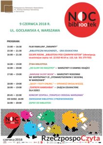 IV Ogólnopolska Noc Bibliotek w PBW w Warszawie Opublikowany 29 maja 2018 przez Iwona Sójkowska W imieniu organizatorów zapraszamy do udziału w IV Ogólnopolskiej Nocy Bibliotek – w PBW w Warszawie 9 czerwca od godz. 15.00!
