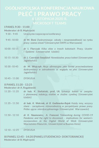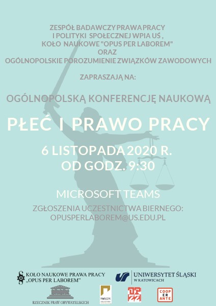 W imieniu organizatorów zapraszamy do wzięcia udziału w Ogólnopolskiej Konferencji Naukowej „Płeć i Prawo Pracy”, która odbędzie się 6 listopada 2020 r. w godz. 9.30-14.20 za pośrednictwem platformy MS Teams. Chęć biernego udziału należy zgłaszać pod adresem: opusperlaborem@us.edu.pl.