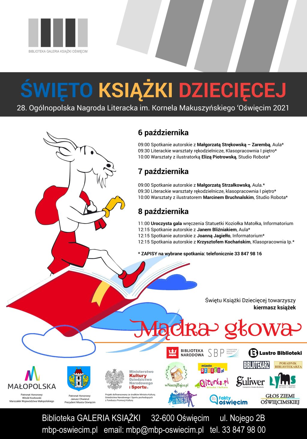 Już 8 października o godz. 11:00 na uroczystej gali w Bibliotece GALERIA KSIĄŻKI w Oświęcimiu poznamy zwycięski tytuł i zdobywcę Koziołka 28. Ogólnopolskiej Nagrody Literackiej. „Mądra głowa” to hasło przewodnie tegorocznej edycji Nagrody, której nadrzędnym celem jest promowanie najlepszych polskich książek dla dzieci, spełniających rygorystyczne kryteria oceny pod względem literackości, przesłania oraz zgodności z radosną wizją twórczości, jaką uprawiał patron – Kornel Makuszyński.