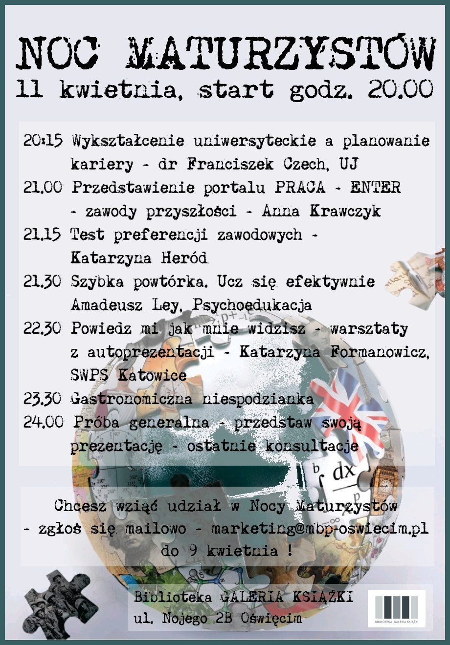 Miejska Biblioteka Publiczna Galeria Książki w Oświęcimiu zaprasza 11 kwietnia na kolejną „Noc Maturzystów”. W programie m.in. szybka powtórka czyli o tym jak powtarzać żeby zapamiętać, warsztaty z autoprezentacji, spotkanie nt. wyboru kierunku studiów i planowania kariery. Będzie również okazja do skonsultowania prezentacji maturalnych.