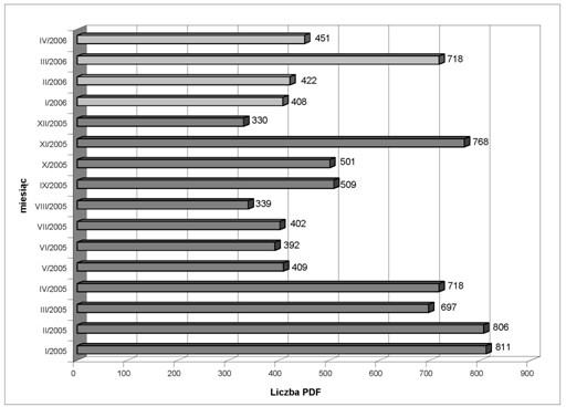 Wykres 1. Wykorzystanie bazy ScienceDirect, I/2005-IV/2006. Wprowadzona do użytkowania w 2005 roku wielodziedzinowa baza SCOPUS wzbudziła duże zainteresowanie w IMP ze względu na możliwość przeszukiwania piśmiennictwa z innych dziedzin w jednym serwisie wraz z naukami medycznymi, co jest szczególnie ważne dla interdyscyplinarnych badań podejmowanych w Instytucie, jak również dzięki temu, że można w niej sprawdzić cytowania i wyłowić publikacje najczęściej cytowane. Można wyszukać cytowania prac poszczególnych autorów, cytowania danego czasopisma, a w szczególności wielu periodyków naukowych wydawanych w Europie. Moduł "Citation tracker" został polecony wszystkim pracownikom Instytutu do wykonania analizy własnych cytowań za 2005 roku. Przeprowadzone szkolenia spotkały się z dużym zainteresowaniem. W oparciu o wyniki uzyskane z bazy SCOPUS powstały dwie publikacje dotyczące cytowań czasopism wydawanych w IMP (International Journal of Occupational Medicine and Environmental Health i Medycyny Pracy). Doświadczenia pracy z czytelnikiem wskazują jednocześnie, że przy dość dobrej znajomości zagranicznych serwisów, umiejętności w zakresie obsługi polskich baz bibliograficznych nie są najlepsze. Przy przyjmowaniu nowego pracownika do pracy w IMP przedstawiane są zasoby biblioteki i możliwości korzystania z dostępnych źródeł. O zakresie korzystania z oferowanych źródeł informacji decydują jego zainteresowania badawcze, a bibliotekarz zawsze służy pomocą. Stopniowe wprowadzanie do prenumeraty czasopism elektronicznych, korzystanie z elektronicznego zamawiania publikacji w bibliotekach medycznych, wprowadzanie baz z dostępem pełnotekstowym, powoduje, że pracownicy niechętnie korzystają ze starych form pozyskiwania publikacji i jeśli trzeba czekać na kserokopię przesyłaną pocztą i często rezygnują z niej. Najczęstszą formą są jednak szkolenia na życzenie, przy komputerze w bibliotece, dopasowane do indywidualnych potrzeb czytelnika. Dezorganizują znacząco pracę bibliotekarza, wymuszają ciągłą gotowość do pracy informacyjnej, ale powodują, że czytelnik ma poczucie wsparcia informacyjnego w bibliotece. Szkolenia z informacji medycznej dla lekarzy w ramach kursu Wprowadzenie do specjalizacji w medycynie pracy prowadzone są w IMP regularnie od trzech lat. Według ankiet przeprowadzonych przez Pracownię Analiz Jakości Kształcenia, w których w skali 1-5 oceniana była zawartość merytoryczna oraz sposób uporządkowania i przekazania materiału zajęciowego przez osobę prowadzącą, część merytoryczną oceniono na 4,3-4,4. Osoba prowadząca otrzymała oceny od 4,5 do 4,7. Natomiast wskaźnik odczuwalnej przydatności zajęć w skali 0-1 oceniono na 0,5. Z otrzymanych ocen wynika, że pomimo pozytywnej oceny zawartości merytorycznej i dobrych metod oraz umiejętności szkolenia w zakresie informacji medycznej nie wszyscy lekarze specjalizujący się w zakresie medycyny pracy są zainteresowani przekazywaną wiedzą. Z roku na rok umiejętności informacyjne słuchaczy tego kursu są coraz większe, oczekiwania ich dotyczą zwiększenia dostępu do elektronicznych zasobów pełnotekstowych w języku polskim, a takich w naukach medycznych jest niewiele. Kształcąc lekarzy praktyków, odczuwamy potrzebę budowania polskich zasobów wiedzy medycznej w zintegrowanych serwisach. Ważną formą kształcenia zarówno pracowników instytutu, jak też lekarzy i innych specjalistów, są referaty i plakaty przedstawiane na konferencjach tematycznych z medycyny pracy czy toksykologii. Każdego roku pracownicy Biblioteki IMP mają możliwość zaprezentowania na zjeździe naukowym Polskiego Towarzystwa Medycyny Pracy lub w czasie sympozjum Polskiego Towarzystwa Higieny Pracy zagadnień związanych ze źródłami informacji o zagrożeniach zdrowotnych w środowisku pracy. Przekazywane informacje szczególnie o internetowych bazach danych, czasopismach elektronicznych spotykają się z dużym zainteresowaniem ze strony uczestników konferencji przyjeżdżających z różnych rejonów Polskich. PodsumowanieWielkość nakładów finansowych ponoszonych na nowe źródła informacji naukowej z roku na rok rośnie przy jednoczesnym zmniejszaniu wydatków na zakup tradycyjnych źródeł informacji (książek i czasopism drukowanych). Stopień wykorzystania nowych źródeł wzrasta, umiejętności informacyjne użytkowników są coraz większe. Odbiorcą informacji naukowej jest w pierwszej kolejności bibliotekarz, to on wspomaga proces decyzyjny o zakupie dostępu do nowych źródeł. Rozpoznaje dostępne na rynku bazy i narzędzia integrujące i zarządzające zasobami, ocenia przydatność ich w danej bibliotece. Stara się pozyskać środki na sfinansowanie zakupów. Jest to bardzo trudne zadanie, gdyż przekonanie o tym, że biblioteka powinna wszystko mieć, tylko nie wiadomo, kto ma za to zapłacić, jest dość powszechne. Efektywność wykorzystywania źródeł informacji naukowej można odnieść nie tylko do poniesionych nakładów finansowych i przydatności ich w danej instytucji. Można także porównać do efektów świadczących o rozwoju nauki w danej instytucji mierzonych np. w postaci liczby publikacji czy wskaźników cytowań. Potrzeby informacyjne użytkowników zostają spełnione wtedy, gdy biblioteka zapewni rzetelny i szybki dostęp do informacji w taki sposób, aby korzystający z niej naukowcy mogli sami nawigować po obszarze niezbędnej wiedzy. Użytkownik będzie mógł swobodnie poruszać się w zakresie pozyskiwania informacji wtedy, gdy będzie do tego zadania przygotowany, zadaniem bibliotekarza jest nadzorowanie potrzeb odbiorców i odpowiednie kształcenie. Ważne jest jednak to, aby bibliotekarz wyprzedzał o kilka kroków użytkowników i sam był odpowiednio przygotowany zarówno w zakresie wiedzy o źródłach medycznych i technikach informacyjnych, jak też rozwijał umiejętność 