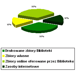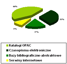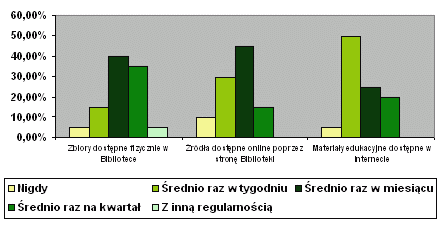 Źródła drukowane i on-line oferowane przez Bibliotekę cenione są wyżej od zbiorów własnych i zasobów internetowych. Za najbardziej użyteczne biblioteczne źródła pozyskiwania informacji uznano w kolejności: katalogi OPAC, czasopisma elektroniczne, bazy bibliograficzne.