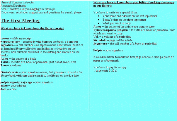Model kształcenia studentów Oddziału Anglojęzycznego - program, metody kształcenia i ocena z punktu widzenia uczestnikówStreszczenieTruizmem jest stwierdzenie, iż jednym z istotnych zadań, które muszą być i są realizowane przez biblioteki naukowe, w tym medyczne, jest przygotowanie użytkowników do korzystania z coraz szerszej palety usług przez nie oferowanych. Jedną z grup, która wymaga szczególnego w tej dziedzinie postępowania są studenci-obcokrajowcy, posługujący się przede wszystkim językiem angielskim. Kurs pt. Sources of Medical Literature, jaki muszą odbyć studenci Oddziału Anglojęzycznego Wydziału Lekarskiego w ramach pierwszego roku, obejmuje następujące zagadnienia: zasady obowiązujące w bibliotece, korzystanie z OPAC-a, medycyna w sieci (wiarygodność informacji w Internecie), korzystanie z fachowych baz danych (abstraktowych i pełnotekstowych), na co zgodnie z programem studiów przeznaczono 10 godzin lekcyjnych. Jednocześnie dzięki analizie ankiety ewaluacyjnej, przeprowadzonej na ostatnich zajęciach wśród studentów tej grupy, można wyciągnąć następujący wniosek: jakkolwiek sam przedmiot nie jest zbyt lubiany przez studentów, dostrzegają oni jego przydatność (choć głównie w przyszłości). Ponadto pojawiały się sugestie dotyczące pewnych zmian w funkcjonowaniu Biblioteki, co - w odczuciu studentów miałoby ułatwić tej grupie korzystanie z jej usług. Wydaje się również, że jednym ze sposobów uatrakcyjnienia tych zajęć mogłoby być wprowadzenie nowej formuły szkolenia, łączącej tradycyjne spotkania w bibliotece z nauczaniem zdalnym z wykorzystaniem e-learningu. ***Truizmem jest stwierdzenie, iż jednym z istotnych zadań, które muszą być i są realizowane przez biblioteki naukowe, w tym medyczne, jest przygotowanie użytkowników do korzystania z coraz szerszej palety usług przez nie oferowanych. Jedną z grup, która wymaga szczególnego w tej dziedzinie postępowania są studenci-obcokrajowcy, posługujący się przede wszystkim językiem angielskim. Przygotowanie programu kształcenia tej grupy użytkowników wymaga uwzględnienia kilku specyficznych elementów, stanowiących o odrębności szkoleń tego typu. Zasadniczą odmiennością jest język wykładowy, jednak przede wszystkim nieco inne oczekiwania tych użytkowników odnośnie samej treści szkolenia, jak i oferty biblioteki. Zwykle zakładamy, że osoby aktywnie korzystające z zasobów biblioteki naukowej (medycznej) to w przeważającej większości profesjonaliści - przedstawiciele szeroko rozumianej kategorii zawodów medycznych i pokrewnych lub studenci Akademii Medycznych. Jednak doświadczenie uczy, że również wśród tak specyficznej grupy użytkowników są osoby, dla których stopień skomputeryzowania różnego rodzaju usług bibliotecznych (począwszy od katalogu przez np. dostęp do medycznych baz danych po korzystanie z usług oferowanych przez Wypożyczalnię Międzybiblioteczną) stanowi przeszkodę i jest źródłem stresu, mającego już swoje fachowe określenie: library anxiety. Wydaje się, że powyższy problem w mniejszym stopniu dotyczy grup studentów anglojęzycznych, nie mających niemal żadnych problemów z podstawową obsługą komputerów, w tym znajomości zasad prowadzenia poszukiwań w Internecie (zwłaszcza w przypadku formułowania prostych zapytań wyszukiwawczych). W tym przypadku mamy do czynienia raczej z czymś, co można nazwać terminem library boredom, a co wynika z dużego oporu, jaki trzeba pokonać, by zaczęli oni aktywnie korzystać z usług biblioteki. Podstawowym elementem utrudniającym bezproblemowe poruszanie się po polskiej bibliotece medycznej (zarówno w wymiarze realnym, jak i usługach stricte informacyjnych) jest bariera językowa. Stąd program kształcenia tej grupy musi uwzględniać ten fakt. Dlatego też, dysponując zaledwie 10 godzinami lekcyjnym, celowym wydaje się stworzenie pewnego schematu, według którego zajęcia tego rodzaju mogą być skutecznie prowadzone (zakładając możliwość wprowadzania a vista koniecznych modyfikacji). Zajęcia pierwsze:The Main Library of The Medical University of Lublin. The first steps. A virtual Journey through the Library. An introductory class Pierwsze spotkanie powinno przygotować studentów do sprawnego poruszania się po wszystkich ważnych dla nich miejscach w bibliotece, nawet w sytuacji kontaktu z osobami, nieznającymi w stopniu wystarczającym języka angielskiego. Uzyskanie już na początku podstawowych informacji, przede wszystkim na temat zasad, jakimi winni się kierować jako użytkownicy biblioteki, przebiega więc dwuetapowo: najpierw dzięki (przygotowanej w formie prezentacji) wirtualnej wycieczce po bibliotece, potem - realnej wizycie we wszystkich ważnych z punktu widzenia studentów miejscach, czyli: w Czytelni Głównej, w Czytelni Czasopism, w Dziale Informacji Naukowej, itp. Połączenie dwóch metod - wykładu ilustrowanego multimedialną prezentacją i klasycznej (tradycyjnej) wycieczki ma na celu utrwalenie informacji na temat funkcjonowania biblioteki i przełamanie pewnego stresu, który może towarzyszyć tej grupie użytkowników na wstępnym etapie pracy w bibliotece. By jednocześnie ułatwić pierwsze kroki w bibliotece studenci otrzymują powyższe informacje w postaci krótkiego informatora (handoutu), z założenia nie obszerniejszego niż jedna kartka formatu A4. Po pierwszych zajęciach handout zawiera: krótki słownik polsko-angielski dotyczący różnych specjalności medycznych (co ma ułatwiać korzystanie z Czytelni Czasopism, w której czasopisma obcojęzyczne są ułożone dziedzinami w języku polskim w układzie alfabetycznym). Druga strona handout'u zawiera podstawowe informacje na temat kontaktu z osobą prowadzącą zajęcia, tłumaczenie podstawowych terminów pojawiających się na różnego rodzaju drukach bibliotecznych, począwszy od rewersu (Por. rys. 1). Zajęcia d