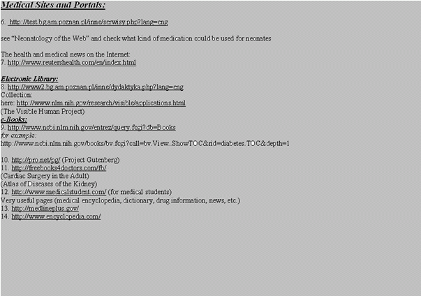 | Model kształcenia studentów Oddziału Anglojęzycznego - program, metody kształcenia i ocena z punktu widzenia uczestników / Anastazja Śniechowska-Karpińska // W: 25. Jubileuszowa Konferencja Problemowa Bibliotek Medycznych. Kształcenie użytkowników naukowej informacji medycznej – koncepcje i doświadczenia. Lublin-Kazimierz Dolny, 12-14 czerwca 2006 roku. - [Warszawa] : Stowarzyszenie Bibliotekarzy Polskich, K[omisja] W[ydawnictw] E[lektronicznych], Redakcja "Elektronicznej Biblioteki", 2006. - (EBIB Materiały konferencyjne nr 14). - ISBN 83-921757-5-1. -Tryb dostępu : http://www.ebib.info/publikacje/matkonf/25kpbm/sniechowska.php |