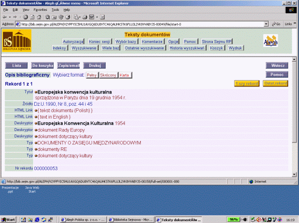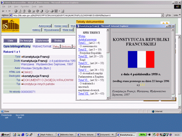 Biblioteka Sejmowa opis bibliograficzny + tekst w ALEPH500