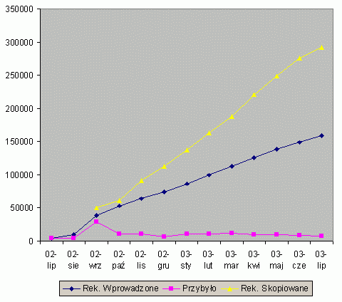Rysunek 1: Przyrost rekordów bibliograficznych dla dokumentów zwartych i ciągłych w katalogu centralnym NUKAT i w katalogach lokalnych.[6] Biblioteki, które uczestniczą we współkatalogowaniu, zyskują nie tylko możliwość nielimitowanego wykorzystania gotowych rekordów w swoim katalogu, ale także zastosowania w nich opisów przedmiotowych wytworzonych w innych bibliotekach. Oszczędzają więc zarówno na opracowaniu formalnym, jak i na opracowaniu przedmiotowym. Wszelkie korekty i modyfikacje wprowadzane w katalogu centralnym pojawiają się automatycznie w katalogach lokalnych, ponieważ wszystkie rekordy zastosowane w katalogach lokalnych, pochodzące z katalogu centralnego, dzięki identyfikacji poprzez numer kontrolny rekordu są automatycznie aktualizowane. Po roku współkatalogowania zawartość katalogu centralnego przedstawia się następująco: Rekordy bibliograficzne w katalogu NUKAT dla wydawnictw zwartych.[7]