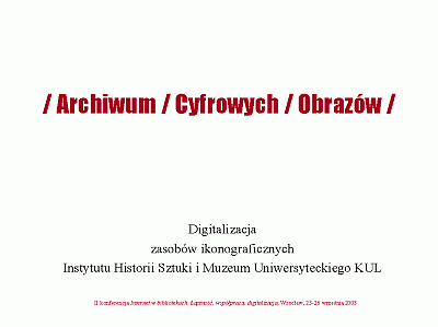 Archiwum Cyfrowych Obrazów - digitalizacja zasobów ikonograficznych Instytutu Historii Sztuki i Muzeum Uniwersyteckiego KUL / Marcin Pastwa // W:Internet w bibliotekach II [Dokument elektroniczny] : łączność, współpraca, digitalizacja : Wrocław, 23-26 września 2003 roku. - Dane tekstowe. - [Warszawa] : Stowarzyszenie Bibliotekarzy Polskich, K[omisja] W[ydawnictw] E[lektronicznych], Redakcja "Elektronicznej Biblioteki", 2003. - (EBIB Materiały konferencyjne). - Tryb dostępu : http://www.ebib.pl/publikacje/matkonf/iwb2/pastwa.php . - Internet w bibliotekach II. - ISBN 83-915689-5-4