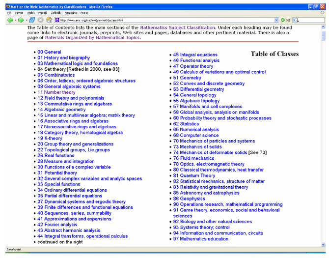 Mathematical Reviews jest czasopismem bibliograficznym, które powstało w 1940 r. z inicjatywy American Mathematical Society. Zawiera dane bibliograficzne o artykułach i książkach matematycznych, które powstały po 1940 r. Baza omawia i recenzuje około 2 miliony artykułów matematycznych z całego świata. Obecnie rocznie przybywa około 65 000 recenzji artykułów i książek. Baza jest dostępna w Internecie pod nazwą MathSciNet. W Polsce dostęp do niej mają wszystkie wydziały matematyki większych uniwersytetów oraz Instytut Matematyczny PAN w ramach konsorcjum prowadzonego przez prof. D. Simsona z Torunia. Zentralblatt für Mathematics jest najdłużej na świecie działającym serwisem bibliograficznym zawierającym ścisłą matematykę i jej zastosowania, stworzonym przez wydawnictwo Springer. Obejmuje, wraz ze swoją poprzedniczką Jahrbuch über die Fortschritte der Mathematik, okres od 1868 r. do chwili obecnej. Zawiera ponad 2 miliony recenzji z artykułów z ponad 2300 tytułów czasopism i serii. Baza jest dostępna w Internecie pod nazwą Zantralblatt MATH. W Polsce dostęp do niej ma około 10 wydziałów matematyki większych uniwersytetów oraz Instytut Matematyczny PAN w ramach konsorcjum prowadzonego przez ICM. Rozdział 2. Opis Mathematics Subject ClassificationPrzyjrzyjmy się budowie Mathematics Subject Classification. Jest to klasyfikacja trzystopniowa, oparta na pięciu znakach: dwóch cyfrach, literze i znowu dwóch cyfrach. Pierwszy poziom, dwucyfrowy, najogólniejszy, zawiera 63 sekcje (zobacz Skan 1).