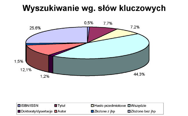 Natomiast w przypadku zdecydowanie rzadszych wyszukiwań wg. słów kluczowych (Rys. 5) aż w 44,3%(+/-4%) wyszukiwano te słowa kluczowe wszędzie, w 12,1%(+/-2,6%) w indeksie autorskim, w 7,7%(+/-2,1%) w tytule, 7,2%(+/-2%) w hasłach przedmiotowych. Duża ilość występowała też wyszukiwań złożonych (łącznie 25,6%+/-3,5%) przy czym aż w 24,8%(+/-3,5%) były to wyszukiwania w których żadna składowa nie dotyczyła jhp a 1,5%(+/-1%) były to wyszukiwania złożone w których co najmniej w jednym składniku wyszukiwano wg. jhp.