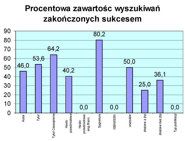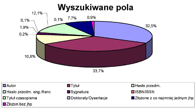 Przeważają więc spośród wyszukiwań pytania o TYTUŁ 33,7%(+/-1,3%) i o AUTORA 32,5%(+/-1,3%), następnie o TYTUŁ CZASOPISMA 12,1%(+/-0,9%), HASŁO PRZEDMIOTOWE 10,8%(+/-0,8%) oraz pytania złożone do wielu lub kilku pól ale również zawierające pytania o HASŁA PRZEDMIOTOWE, w szczególności dość liczna grupa pytań o wszystko 7,7%(+/-0,7%). Następną grupą są pytania o SYGNATURĘ 1,9%(+/-0,4%), złożone pytania do wielu pól bez jhp KABA 0,9%(+/-0,2%) oraz w granicach 0,1%(+/-0,09%) HASŁO PRZEDMIOTOWE ANG./FRANC., DOKTORATY i DYSERTACJE oraz o numer ISBN/ISSN. Hasła przedmiotowe dość rzadko interesują więc użytkowników.