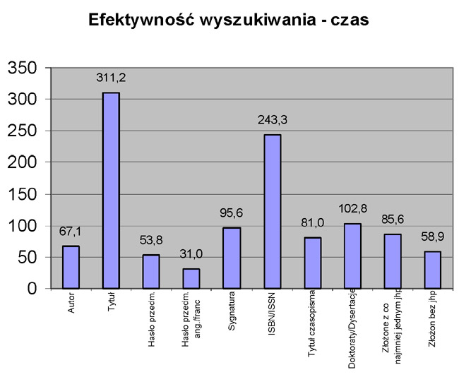 Długi czas oglądania ekranu przez użytkownika (Rys. 8) świadczy o tym, że dużo jest pozycji interesujących tematycznie (w przeciwnym razie użytkownik odrzuciłby szybko przeglądane pozycje), ale nie ma pozycji bardzo dobrych dla użytkownika (wtedy również użytkownik szybko przeszedłby do rekordu bibliograficznego). Długi czas wyszukiwania nie mówi więc o efektywności wyszukiwania, ale raczej o trudnościach interpretacyjnych użytkownika. Analiza czasu wskazuje, że najwięcej kłopotu użytkownikom sprawia interpretacja wyników wyszukiwania za pomocą tytułu i za pomocą numeru ISBN/ISSN. Tutaj wyniki wyszukiwań hasłami przedmiotowymi należą do najszybciej interpretowalnych
