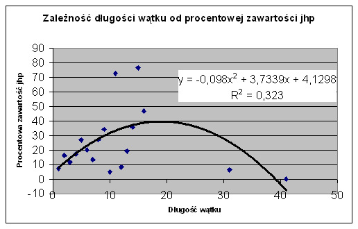Rys. 13. Zależność długości wątku od procentowej ilości użytych w nim wyszukiwań według jhp KABA