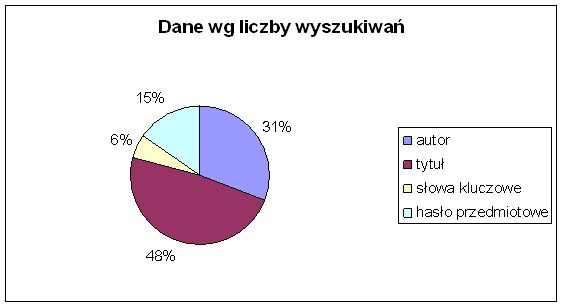 Widać to szczególnie podczas analizy danych wykresów nr 1b i nr 2, przy kryteriach wyszukiwania poprzez tytuł, słowa kluczowe, hasła przedmiotowe. Ankietowani czytelnicy (Wykres nr 1b), aż 42,5%, deklarowali wyszukiwanie poprzez słowa kluczowe i hasła przedmiotowe, natomiast analiza danych komputerowych (Wykres nr 2) wykazała, że liczba tych wyszukiwań jest znacznie niższa (21%), natomiast zdecydowana większość (48%) wyszukiwań dotyczyła kryterium tytuł.