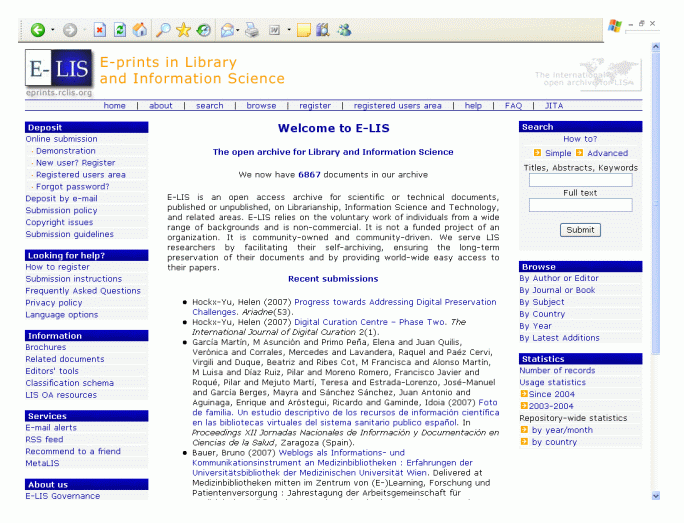 Library and information domain being highly integrated with computing science and technology, bibliometric and citational analysis, the team that launched this project felt that LIS could set an interesting reference case to other communities in providing a state-of-the-art model for the OA movement and for digital libraries, and most particularly to the open archive model, within which E-LIS is a disciplinary repository. Furthermore the evolving academic discourse surrounding the concept of Open Access (OA) provided the underlying motivation for the establishment of E-LIS Eprints for Library and Information Science in compliance with the Open Archives Initiative (OAI) protocol.