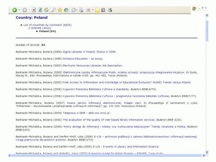 - BEDNAREK-MICHALSKA, B., DERFERT-WOLF, L. E-LIS: E-prints in Library and Information Science [on-line]. 2005 [dostęp 29 listopada 2007]. Dostępny w World Wide Web: http://eprints.rclis.org/5315/.