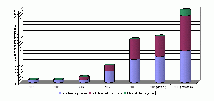 Uruchomienie WBC zapoczątkowało proces tworzenia kolejnych bibliotek cyfrowych. W 2004 roku powstała Biblioteka Cyfrowa Politechniki Wrocławskiej, przekształcona później w Dolnośląską Bibliotekę Cyfrową. Poza WBC, największe obecnie biblioteki cyfrowe to: Kujawsko-Pomorska Biblioteka Cyfrowa (ok. 15 000 publikacji), Biblioteka Cyfrowa Uniwersytetu Wrocławskiego (ok. 10 000 publikacji) oraz Śląska Biblioteka Cyfrowa, Małopolska Biblioteka Cyfrowa i Cyfrowa Biblioteka Narodowa POLONA (każda po ok. 5 000 publikacji). Łącznie wszystkie biblioteki cyfrowe udostępniają około 90 000 cyfrowych dokumentów. Dynamika wzrostu liczby bibliotek cyfrowych w Polsce przedstawiona jest na rysunku 1. Obecnie funkcjonuje 16 bibliotek cyfrowych opartych na oprogramowaniu dLibra, spośród których 9 to regionalne biblioteki cyfrowe, a 7 to biblioteki instytucjonalne. W roku 2008 prawdopodobnie udostępnione zostaną pierwsze tematyczne biblioteki cyfrowe. Treści do tych bibliotek opracowywane są przez ponad 150 instytucji.