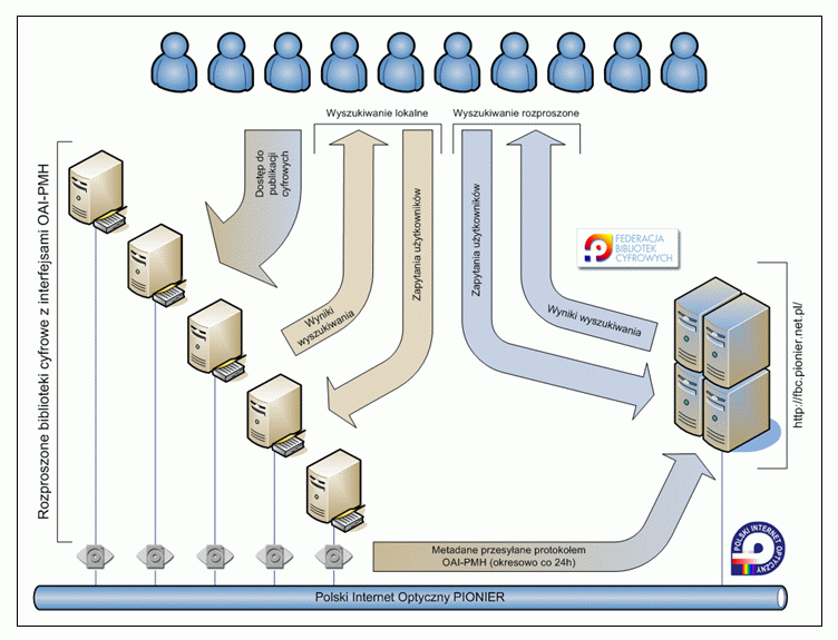 Tak duża liczba bibliotek cyfrowych oraz treści cyfrowych dostępnych on-line stały się podstawą do rozpoczęcia prac nad stworzeniem jednolitej infrastruktury działającej w skali całego kraju. W dążeniach nad ujednoliceniem infrastruktury pomógł projekt badawczy nr 3 T11C 023 30 Ministerstwa Nauki i Szkolnictwa Wyższego: „Mechanizmy usług atomowych dla rozproszonych bibliotek cyfrowych” zrealizowany przez PCSS. Dzięki pracom badawczo-rozwojowym uruchomione w sieci Polski Internet Optyczny PIONIER biblioteki cyfrowe zostały połączone przy pomocy protokołu OAI-PMH http://www.openarchives.org/OAI/openarchivesprotocol.html.Służący do wymiany metadanych protokół umożliwił zrealizowanie mechanizmu wyszukiwania rozproszonego, pozwalającego na przeszukiwanie opisów zasobów cyfrowych wszystkich bibliotek opartych na oprogramowaniu dLibra z poziomu ich stron WWW[2]. Wykorzystanie protokołu OAI-PMH spowodowało również powstanie automatycznie nadawanych, unikalnych w skali światowej, identyfikatorów udostępnianych obiektów cyfrowych.