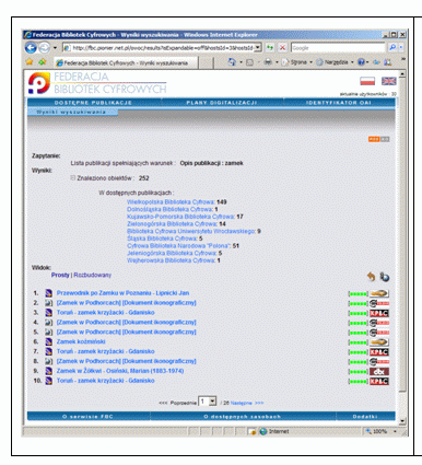Rys. 3. Przykładowe wyniki wyszukiwania w serwisie FBC (http://fbc.pionier.net.pl, dostęp15.09.2007 roku).