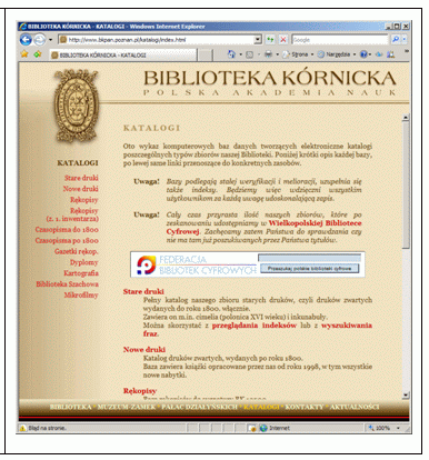 Rys. 4. Strona katalogów Biblioteki Kórnickiej PAN z osadzoną mini wyszukiwarką FBC (http://www.bkpan.poznan.pl/katalogi/index.html, dostęp 15.09.2007 roku).