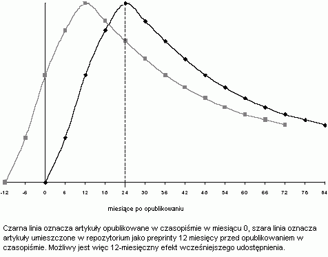 Jedne z pierwszych badań, w których uwzględniono, że cytowania prac umieszczonych w repozytorium ArXiv jako preprinty funkcjonują wcześniej niż dla artykułów bez preprintów, przeprowadzono w 2004 roku[13]. Porównywane były cytowania do artykułów umieszczonych w repozytorium ArXiv z artykułami publikowanymi w czasopiśmie z dziedziny astrofizyki. Autorzy porównywali cytowania do artykułów z repozytorium w obrębie ograniczonych zasobów danych o cytowaniach Astrophysics Data System NASA do artykułów nieumieszczonych w repozytorium, a opublikowanych w czasopiśmie w latach 1999 do 2002. W tym ostatnim roku 72% artykułów z czasopisma umieszczonych zostało w repozytorium. Badanie wykazało, artykuły OA mają ponad dwa razy wyższy wskaźnik cytowań niż pozostałe (włączając w to samocytowania). Zastosowano stałe okno cytowań przez liczenie cytowań do artykułów opublikowanych w drugiej połowie 1999 roku do stałego punktu w 2003 roku. Późniejsze badania na większej liczbie czasopism potwierdziły te rezultaty.